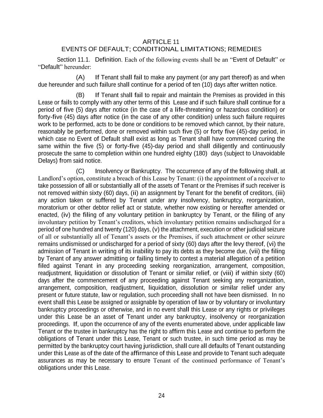 24 ARTICLE 11 EVENTS OF DEFAULT; CONDITIONAL LIMITATIONS; REMEDIES Section 11.1. Definition. Each of the following events shall be an “Event of Default” or “Default” hereunder: (A) If Tenant shall fail to make any payment (or any part thereof) as and when due hereunder and such failure shall continue for a period of ten (10) days after written notice. (B) If Tenant shall fail to repair and maintain the Premises as provided in this Lease or fails to comply with any other terms of this Lease and if such failure shall continue for a period of five (5) days after notice (in the case of a life-threatening or hazardous condition) or forty-five (45) days after notice (in the case of any other condition) unless such failure requires work to be performed, acts to be done or conditions to be removed which cannot, by their nature, reasonably be performed, done or removed within such five (5) or forty five (45)-day period, in which case no Event of Default shall exist as long as Tenant shall have commenced curing the same within the five (5) or forty-five (45)-day period and shall diligently and continuously prosecute the same to completion within one hundred eighty (180) days (subject to Unavoidable Delays) from said notice. (C) Insolvency or Bankruptcy. The occurrence of any of the following shall, at Landlord’s option, constitute a breach of this Lease by Tenant: (i) the appointment of a receiver to take possession of all or substantially all of the assets of Tenant or the Premises if such receiver is not removed within sixty (60) days, (ii) an assignment by Tenant for the benefit of creditors, (iii) any action taken or suffered by Tenant under any insolvency, bankruptcy, reorganization, moratorium or other debtor relief act or statute, whether now existing or hereafter amended or enacted, (iv) the filing of any voluntary petition in bankruptcy by Tenant, or the filing of any involuntary petition by Tenant’s creditors, which involuntary petition remains undischarged for a period of one hundred and twenty (120) days, (v) the attachment, execution or other judicial seizure of all or substantially all of Tenant’s assets or the Premises, if such attachment or other seizure remains undismissed or undischarged for a period of sixty (60) days after the levy thereof, (vi) the admission of Tenant in writing of its inability to pay its debts as they become due, (vii) the filing by Tenant of any answer admitting or failing timely to contest a material allegation of a petition filed against Tenant in any proceeding seeking reorganization, arrangement, composition, readjustment, liquidation or dissolution of Tenant or similar relief, or (viii) if within sixty (60) days after the commencement of any proceeding against Tenant seeking any reorganization, arrangement, composition, readjustment, liquidation, dissolution or similar relief under any present or future statute, law or regulation, such proceeding shall not have been dismissed. In no event shall this Lease be assigned or assignable by operation of law or by voluntary or involuntary bankruptcy proceedings or otherwise, and in no event shall this Lease or any rights or privileges under this Lease be an asset of Tenant under any bankruptcy, insolvency or reorganization proceedings. If, upon the occurrence of any of the events enumerated above, under applicable law Tenant or the trustee in bankruptcy has the right to affirm this Lease and continue to perform the obligations of Tenant under this Lease, Tenant or such trustee, in such time period as may be permitted by the bankruptcy court having jurisdiction, shall cure all defaults of Tenant outstanding under this Lease as of the date of the affirmance of this Lease and provide to Tenant such adequate assurances as may be necessary to ensure Tenant of the continued performance of Tenant’s obligations under this Lease.