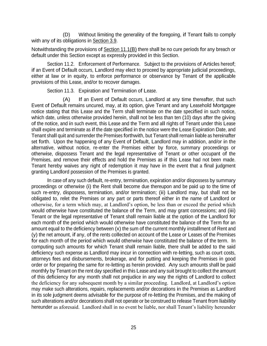 25 (D) Without limiting the generality of the foregoing, if Tenant fails to comply with any of its obligations in Section 3.9. Notwithstanding the provisions of Section 11.1(B) there shall be no cure periods for any breach or default under this Section except as expressly provided in this Section. Section 11.2. Enforcement of Performance. Subject to the provisions of Articles hereof; if an Event of Default occurs, Landlord may elect to proceed by appropriate judicial proceedings, either at law or in equity, to enforce performance or observance by Tenant of the applicable provisions of this Lease, and/or to recover damages. Section 11.3. Expiration and Termination of Lease. (A) If an Event of Default occurs, Landlord at any time thereafter, that such Event of Default remains uncured, may, at its option, give Tenant and any Leasehold Mortgagee notice stating that this Lease and the Term shall terminate on the date specified in such notice, which date, unless otherwise provided herein, shall not be less than ten (10) days after the giving of the notice, and in such event, this Lease and the Term and all rights of Tenant under this Lease shall expire and terminate as if the date specified in the notice were the Lease Expiration Date, and Tenant shall quit and surrender the Premises forthwith, but Tenant shall remain liable as hereinafter set forth. Upon the happening of any Event of Default, Landlord may in addition, and/or in the alternative, without notice, re-enter the Premises either by force, summary proceedings or otherwise, dispossess Tenant and the legal representative of Tenant or other occupant of the Premises, and remove their effects and hold the Premises as if this Lease had not been made. Tenant hereby waives any right of redemption it may have in the event that a final judgment granting Landlord possession of the Premises is granted. In case of any such default, re-entry, termination, expiration and/or dispossess by summary proceedings or otherwise (i) the Rent shall become due thereupon and be paid up to the time of such re-entry, dispossess, termination, and/or termination; (ii) Landlord may, but shall not be obligated to, relet the Premises or any part or parts thereof either in the name of Landlord or otherwise, for a term which may, at Landlord’s option, be less than or exceed the period which would otherwise have constituted the balance of the Term, and may grant concessions; and (iii) Tenant or the legal representative of Tenant shall remain liable at the option of the Landlord for each month of the period which would otherwise have constituted the balance of the Term for an amount equal to the deficiency between (x) the sum of the current monthly installment of Rent and (y) the net amount, if any, of the rents collected on account of the Lease or Leases of the Premises for each month of the period which would otherwise have constituted the balance of the term. In computing such amounts for which Tenant shall remain liable, there shall be added to the said deficiency such expense as Landlord may incur in connection with re-letting, such as court costs, attorneys fees and disbursements, brokerage, and for putting and keeping the Premises in good order or for preparing the same for re-letting as herein provided. Any such amounts shall be paid monthly by Tenant on the rent day specified in this Lease and any suit brought to collect the amount of this deficiency for any month shall not prejudice in any way the rights of Landlord to collect the deficiency for any subsequent month by a similar proceeding. Landlord, at Landlord’s option may make such alterations, repairs, replacements and/or decorations in the Premises as Landlord in its sole judgment deems advisable for the purpose of re-letting the Premises, and the making of such alterations and/or decorations shall not operate or be construed to release Tenant from liability hereunder as aforesaid. Landlord shall in no event be liable, nor shall Tenant’s liability hereunder
