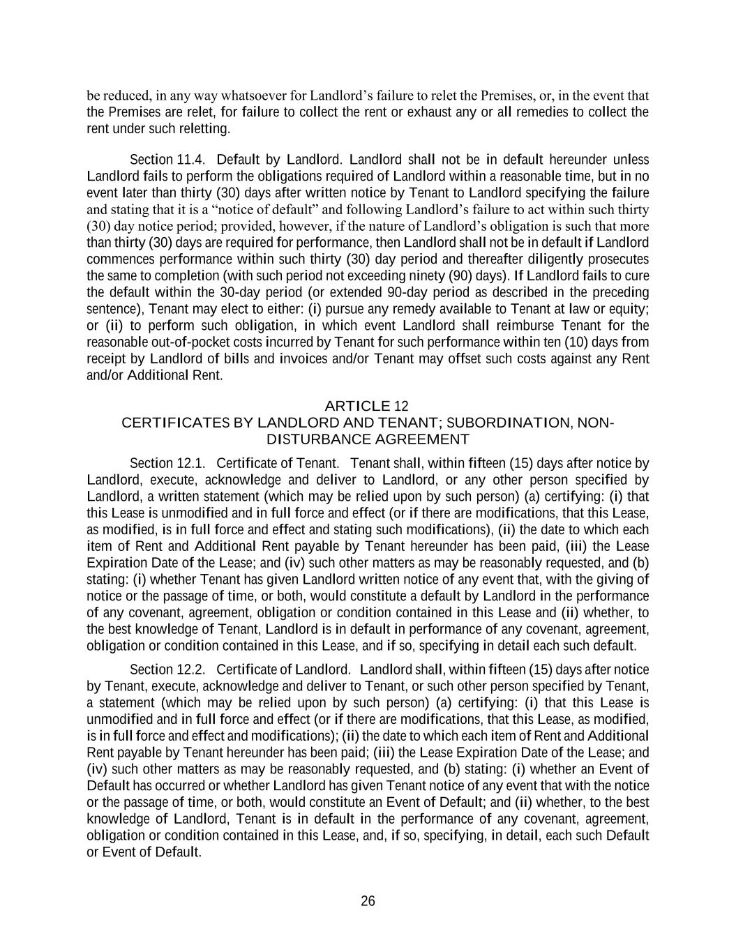 26 be reduced, in any way whatsoever for Landlord’s failure to relet the Premises, or, in the event that the Premises are relet, for failure to collect the rent or exhaust any or all remedies to collect the rent under such reletting. Section 11.4. Default by Landlord. Landlord shall not be in default hereunder unless Landlord fails to perform the obligations required of Landlord within a reasonable time, but in no event later than thirty (30) days after written notice by Tenant to Landlord specifying the failure and stating that it is a “notice of default” and following Landlord’s failure to act within such thirty (30) day notice period; provided, however, if the nature of Landlord’s obligation is such that more than thirty (30) days are required for performance, then Landlord shall not be in default if Landlord commences performance within such thirty (30) day period and thereafter diligently prosecutes the same to completion (with such period not exceeding ninety (90) days). If Landlord fails to cure the default within the 30-day period (or extended 90-day period as described in the preceding sentence), Tenant may elect to either: (i) pursue any remedy available to Tenant at law or equity; or (ii) to perform such obligation, in which event Landlord shall reimburse Tenant for the reasonable out-of-pocket costs incurred by Tenant for such performance within ten (10) days from receipt by Landlord of bills and invoices and/or Tenant may offset such costs against any Rent and/or Additional Rent. ARTICLE 12 CERTIFICATES BY LANDLORD AND TENANT; SUBORDINATION, NON- DISTURBANCE AGREEMENT Section 12.1. Certificate of Tenant. Tenant shall, within fifteen (15) days after notice by Landlord, execute, acknowledge and deliver to Landlord, or any other person specified by Landlord, a written statement (which may be relied upon by such person) (a) certifying: (i) that this Lease is unmodified and in full force and effect (or if there are modifications, that this Lease, as modified, is in full force and effect and stating such modifications), (ii) the date to which each item of Rent and Additional Rent payable by Tenant hereunder has been paid, (iii) the Lease Expiration Date of the Lease; and (iv) such other matters as may be reasonably requested, and (b) stating: (i) whether Tenant has given Landlord written notice of any event that, with the giving of notice or the passage of time, or both, would constitute a default by Landlord in the performance of any covenant, agreement, obligation or condition contained in this Lease and (ii) whether, to the best knowledge of Tenant, Landlord is in default in performance of any covenant, agreement, obligation or condition contained in this Lease, and if so, specifying in detail each such default. Section 12.2. Certificate of Landlord. Landlord shall, within fifteen (15) days after notice by Tenant, execute, acknowledge and deliver to Tenant, or such other person specified by Tenant, a statement (which may be relied upon by such person) (a) certifying: (i) that this Lease is unmodified and in full force and effect (or if there are modifications, that this Lease, as modified, is in full force and effect and modifications); (ii) the date to which each item of Rent and Additional Rent payable by Tenant hereunder has been paid; (iii) the Lease Expiration Date of the Lease; and (iv) such other matters as may be reasonably requested, and (b) stating: (i) whether an Event of Default has occurred or whether Landlord has given Tenant notice of any event that with the notice or the passage of time, or both, would constitute an Event of Default; and (ii) whether, to the best knowledge of Landlord, Tenant is in default in the performance of any covenant, agreement, obligation or condition contained in this Lease, and, if so, specifying, in detail, each such Default or Event of Default.