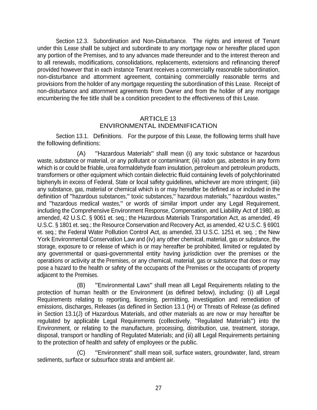 27 Section 12.3. Subordination and Non-Disturbance. The rights and interest of Tenant under this Lease shall be subject and subordinate to any mortgage now or hereafter placed upon any portion of the Premises, and to any advances made thereunder and to the interest thereon and to all renewals, modifications, consolidations, replacements, extensions and refinancing thereof provided however that in each instance Tenant receives a commercially reasonable subordination, non-disturbance and attornment agreement, containing commercially reasonable terms and provisions from the holder of any mortgage requesting the subordination of this Lease. Receipt of non-disturbance and attornment agreements from Owner and from the holder of any mortgage encumbering the fee title shall be a condition precedent to the effectiveness of this Lease. ARTICLE 13 ENVIRONMENTAL INDEMNIFICATION Section 13.1. Definitions. For the purpose of this Lease, the following terms shall have the following definitions: (A) "Hazardous Materials" shall mean (i) any toxic substance or hazardous waste, substance or material, or any pollutant or contaminant; (ii) radon gas, asbestos in any form which is or could be friable, urea formaldehyde foam insulation, petroleum and petroleum products, transformers or other equipment which contain dielectric fluid containing levels of polychlorinated biphenyls in excess of Federal, State or local safety guidelines, whichever are more stringent; (iii) any substance, gas, material or chemical which is or may hereafter be defined as or included in the definition of "hazardous substances," toxic substances," hazardous materials," hazardous wastes," and "hazardous medical wastes," or words of similar import under any Legal Requirement, including the Comprehensive Environment Response, Compensation, and Liability Act of 1980, as amended, 42 U.S.C. § 9061 et. seq.; the Hazardous Materials Transportation Act, as amended, 49 U.S.C. § 1801 et. seq.; the Resource Conservation and Recovery Act, as amended, 42 U.S.C. § 6901 et. seq.; the Federal Water Pollution Control Act, as amended, 33 U.S.C. 1251 et. seq. ; the New York Environmental Conservation Law and (iv) any other chemical, material, gas or substance, the storage, exposure to or release of which is or may hereafter be prohibited, limited or regulated by any governmental or quasi-governmental entity having jurisdiction over the premises or the operations or activity at the Premises, or any chemical, material, gas or substance that does or may pose a hazard to the health or safety of the occupants of the Premises or the occupants of property adjacent to the Premises. (B) "Environmental Laws" shall mean all Legal Requirements relating to the protection of human health or the Environment (as defined below), including: (i) all Legal Requirements relating to reporting, licensing, permitting, investigation and remediation of emissions, discharges, Releases (as defined in Section 13.1 (H) or Threats of Release (as defined in Section 13.1(J) of Hazardous Materials, and other materials as are now or may hereafter be regulated by applicable Legal Requirements (collectively, "Regulated Materials") into the Environment, or relating to the manufacture, processing, distribution, use, treatment, storage, disposal, transport or handling of Regulated Materials; and (ii) all Legal Requirements pertaining to the protection of health and safety of employees or the public. (C) "Environment" shall mean soil, surface waters, groundwater, land, stream sediments, surface or subsurface strata and ambient air.