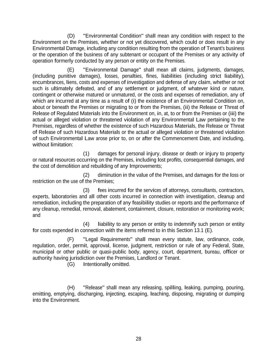28 (D) "Environmental Condition" shall mean any condition with respect to the Environment on the Premises, whether or not yet discovered, which could or does result in any Environmental Damage, including any condition resulting from the operation of Tenant's business or the operation of the business of any subtenant or occupant of the Premises or any activity of operation formerly conducted by any person or entity on the Premises. (E) "Environmental Damage" shall mean all claims, judgments, damages, (including punitive damages), losses, penalties, fines, liabilities (including strict liability), encumbrances, liens, costs and expenses of investigation and defense of any claim, whether or not such is ultimately defeated, and of any settlement or judgment, of whatever kind or nature, contingent or otherwise matured or unmatured, or the costs and expenses of remediation, any of which are incurred at any time as a result of (i) the existence of an Environmental Condition on, about or beneath the Premises or migrating to or from the Premises, (ii) the Release or Threat of Release of Regulated Materials into the Environment on, in, at, to or from the Premises or (iii) the actual or alleged violation or threatened violation of any Environmental Law pertaining to the Premises, regardless of whether the existence of such Hazardous Materials, the Release or Threat of Release of such Hazardous Materials or the actual or alleged violation or threatened violation of such Environmental Law arose prior to, on or after the Commencement Date, and including, without limitation: (1) damages for personal injury, disease or death or injury to property or natural resources occurring on the Premises, including lost profits, consequential damages, and the cost of demolition and rebuilding of any Improvements; (2) diminution in the value of the Premises, and damages for the loss or restriction on the use of the Premises; (3) fees incurred for the services of attorneys, consultants, contractors, experts, laboratories and all other costs incurred in connection with investigation, cleanup and remediation, including the preparation of any feasibility studies or reports and the performance of any cleanup, remedial, removal, abatement, containment, closure, restoration or monitoring work; and (4) liability to any person or entity to indemnify such person or entity for costs expended in connection with the items referred to in this Section 13.1 (E). (F) "Legal Requirements" shall mean every statute, law, ordinance, code, regulation, order, permit, approval, license, judgment, restriction or rule of any Federal, State, municipal or other public or quasi-public body, agency, court, department, bureau, officer or authority having jurisdiction over the Premises, Landlord or Tenant. (G) Intentionally omitted. (H) "Release" shall mean any releasing, spilling, leaking, pumping, pouring, emitting, emptying, discharging, injecting, escaping, leaching, disposing, migrating or dumping into the Environment.
