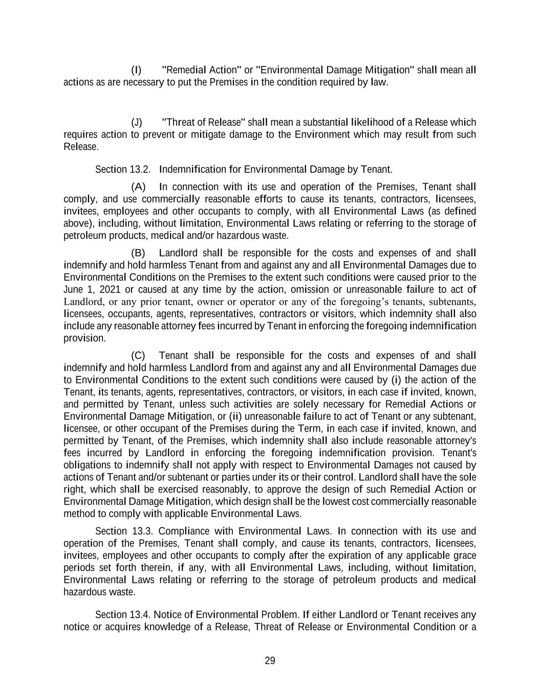29 (I) "Remedial Action" or "Environmental Damage Mitigation" shall mean all actions as are necessary to put the Premises in the condition required by law. (J) "Threat of Release" shall mean a substantial likelihood of a Release which requires action to prevent or mitigate damage to the Environment which may result from such Release. Section 13.2. Indemnification for Environmental Damage by Tenant. (A) In connection with its use and operation of the Premises, Tenant shall comply, and use commercially reasonable efforts to cause its tenants, contractors, licensees, invitees, employees and other occupants to comply, with all Environmental Laws (as defined above), including, without limitation, Environmental Laws relating or referring to the storage of petroleum products, medical and/or hazardous waste. (B) Landlord shall be responsible for the costs and expenses of and shall indemnify and hold harmless Tenant from and against any and all Environmental Damages due to Environmental Conditions on the Premises to the extent such conditions were caused prior to the June 1, 2021 or caused at any time by the action, omission or unreasonable failure to act of Landlord, or any prior tenant, owner or operator or any of the foregoing’s tenants, subtenants, licensees, occupants, agents, representatives, contractors or visitors, which indemnity shall also include any reasonable attorney fees incurred by Tenant in enforcing the foregoing indemnification provision. (C) Tenant shall be responsible for the costs and expenses of and shall indemnify and hold harmless Landlord from and against any and all Environmental Damages due to Environmental Conditions to the extent such conditions were caused by (i) the action of the Tenant, its tenants, agents, representatives, contractors, or visitors, in each case if invited, known, and permitted by Tenant, unless such activities are solely necessary for Remedial Actions or Environmental Damage Mitigation, or (ii) unreasonable failure to act of Tenant or any subtenant, licensee, or other occupant of the Premises during the Term, in each case if invited, known, and permitted by Tenant, of the Premises, which indemnity shall also include reasonable attorney's fees incurred by Landlord in enforcing the foregoing indemnification provision. Tenant's obligations to indemnify shall not apply with respect to Environmental Damages not caused by actions of Tenant and/or subtenant or parties under its or their control. Landlord shall have the sole right, which shall be exercised reasonably, to approve the design of such Remedial Action or Environmental Damage Mitigation, which design shall be the lowest cost commercially reasonable method to comply with applicable Environmental Laws. Section 13.3. Compliance with Environmental Laws. In connection with its use and operation of the Premises, Tenant shall comply, and cause its tenants, contractors, licensees, invitees, employees and other occupants to comply after the expiration of any applicable grace periods set forth therein, if any, with all Environmental Laws, including, without limitation, Environmental Laws relating or referring to the storage of petroleum products and medical hazardous waste. Section 13.4. Notice of Environmental Problem. If either Landlord or Tenant receives any notice or acquires knowledge of a Release, Threat of Release or Environmental Condition or a