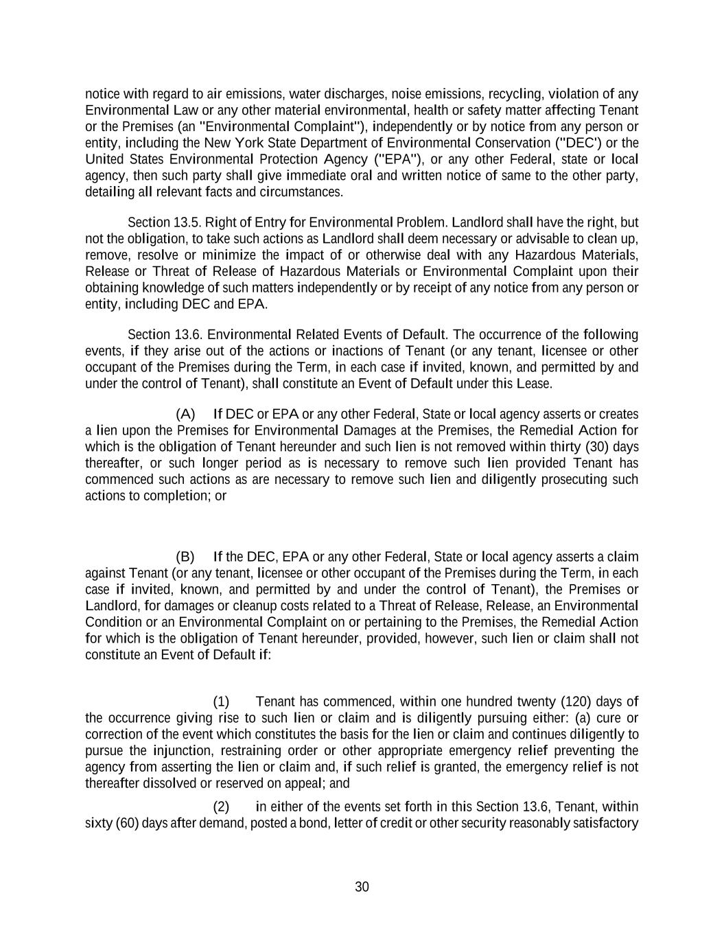 30 notice with regard to air emissions, water discharges, noise emissions, recycling, violation of any Environmental Law or any other material environmental, health or safety matter affecting Tenant or the Premises (an "Environmental Complaint"), independently or by notice from any person or entity, including the New York State Department of Environmental Conservation ("DEC') or the United States Environmental Protection Agency ("EPA"), or any other Federal, state or local agency, then such party shall give immediate oral and written notice of same to the other party, detailing all relevant facts and circumstances. Section 13.5. Right of Entry for Environmental Problem. Landlord shall have the right, but not the obligation, to take such actions as Landlord shall deem necessary or advisable to clean up, remove, resolve or minimize the impact of or otherwise deal with any Hazardous Materials, Release or Threat of Release of Hazardous Materials or Environmental Complaint upon their obtaining knowledge of such matters independently or by receipt of any notice from any person or entity, including DEC and EPA. Section 13.6. Environmental Related Events of Default. The occurrence of the following events, if they arise out of the actions or inactions of Tenant (or any tenant, licensee or other occupant of the Premises during the Term, in each case if invited, known, and permitted by and under the control of Tenant), shall constitute an Event of Default under this Lease. (A) If DEC or EPA or any other Federal, State or local agency asserts or creates a lien upon the Premises for Environmental Damages at the Premises, the Remedial Action for which is the obligation of Tenant hereunder and such lien is not removed within thirty (30) days thereafter, or such longer period as is necessary to remove such lien provided Tenant has commenced such actions as are necessary to remove such lien and diligently prosecuting such actions to completion; or (B) If the DEC, EPA or any other Federal, State or local agency asserts a claim against Tenant (or any tenant, licensee or other occupant of the Premises during the Term, in each case if invited, known, and permitted by and under the control of Tenant), the Premises or Landlord, for damages or cleanup costs related to a Threat of Release, Release, an Environmental Condition or an Environmental Complaint on or pertaining to the Premises, the Remedial Action for which is the obligation of Tenant hereunder, provided, however, such lien or claim shall not constitute an Event of Default if: (1) Tenant has commenced, within one hundred twenty (120) days of the occurrence giving rise to such lien or claim and is diligently pursuing either: (a) cure or correction of the event which constitutes the basis for the lien or claim and continues diligently to pursue the injunction, restraining order or other appropriate emergency relief preventing the agency from asserting the lien or claim and, if such relief is granted, the emergency relief is not thereafter dissolved or reserved on appeal; and (2) in either of the events set forth in this Section 13.6, Tenant, within sixty (60) days after demand, posted a bond, letter of credit or other security reasonably satisfactory