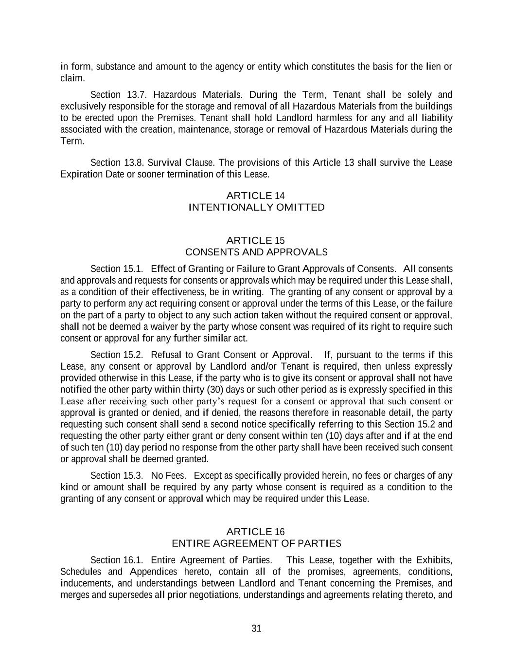 31 in form, substance and amount to the agency or entity which constitutes the basis for the lien or claim. Section 13.7. Hazardous Materials. During the Term, Tenant shall be solely and exclusively responsible for the storage and removal of all Hazardous Materials from the buildings to be erected upon the Premises. Tenant shall hold Landlord harmless for any and all liability associated with the creation, maintenance, storage or removal of Hazardous Materials during the Term. Section 13.8. Survival Clause. The provisions of this Article 13 shall survive the Lease Expiration Date or sooner termination of this Lease. ARTICLE 14 INTENTIONALLY OMITTED ARTICLE 15 CONSENTS AND APPROVALS Section 15.1. Effect of Granting or Failure to Grant Approvals of Consents. All consents and approvals and requests for consents or approvals which may be required under this Lease shall, as a condition of their effectiveness, be in writing. The granting of any consent or approval by a party to perform any act requiring consent or approval under the terms of this Lease, or the failure on the part of a party to object to any such action taken without the required consent or approval, shall not be deemed a waiver by the party whose consent was required of its right to require such consent or approval for any further similar act. Section 15.2. Refusal to Grant Consent or Approval. If, pursuant to the terms if this Lease, any consent or approval by Landlord and/or Tenant is required, then unless expressly provided otherwise in this Lease, if the party who is to give its consent or approval shall not have notified the other party within thirty (30) days or such other period as is expressly specified in this Lease after receiving such other party’s request for a consent or approval that such consent or approval is granted or denied, and if denied, the reasons therefore in reasonable detail, the party requesting such consent shall send a second notice specifically referring to this Section 15.2 and requesting the other party either grant or deny consent within ten (10) days after and if at the end of such ten (10) day period no response from the other party shall have been received such consent or approval shall be deemed granted. Section 15.3. No Fees. Except as specifically provided herein, no fees or charges of any kind or amount shall be required by any party whose consent is required as a condition to the granting of any consent or approval which may be required under this Lease. ARTICLE 16 ENTIRE AGREEMENT OF PARTIES Section 16.1. Entire Agreement of Parties. This Lease, together with the Exhibits, Schedules and Appendices hereto, contain all of the promises, agreements, conditions, inducements, and understandings between Landlord and Tenant concerning the Premises, and merges and supersedes all prior negotiations, understandings and agreements relating thereto, and