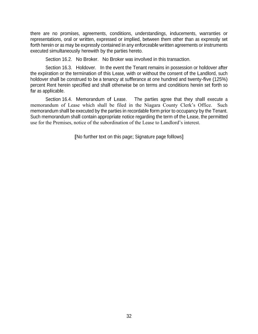 32 there are no promises, agreements, conditions, understandings, inducements, warranties or representations, oral or written, expressed or implied, between them other than as expressly set forth herein or as may be expressly contained in any enforceable written agreements or instruments executed simultaneously herewith by the parties hereto. Section 16.2. No Broker. No Broker was involved in this transaction. Section 16.3. Holdover. In the event the Tenant remains in possession or holdover after the expiration or the termination of this Lease, with or without the consent of the Landlord, such holdover shall be construed to be a tenancy at sufferance at one hundred and twenty-five (125%) percent Rent herein specified and shall otherwise be on terms and conditions herein set forth so far as applicable. Section 16.4. Memorandum of Lease. The parties agree that they shall execute a memorandum of Lease which shall be filed in the Niagara County Clerk’s Office. Such memorandum shall be executed by the parties in recordable form prior to occupancy by the Tenant. Such memorandum shall contain appropriate notice regarding the term of the Lease, the permitted use for the Premises, notice of the subordination of the Lease to Landlord’s interest. [No further text on this page; Signature page follows]