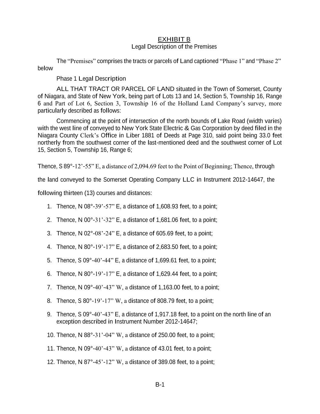 B-1 EXHIBIT B Legal Description of the Premises The “Premises” comprises the tracts or parcels of Land captioned “Phase 1” and “Phase 2” below Phase 1 Legal Description ALL THAT TRACT OR PARCEL OF LAND situated in the Town of Somerset, County of Niagara, and State of New York, being part of Lots 13 and 14, Section 5, Township 16, Range 6 and Part of Lot 6, Section 3, Township 16 of the Holland Land Company’s survey, more particularly described as follows: Commencing at the point of intersection of the north bounds of Lake Road (width varies) with the west line of conveyed to New York State Electric & Gas Corporation by deed filed in the Niagara County Clerk’s Office in Liber 1881 of Deeds at Page 310, said point being 33.0 feet northerly from the southwest corner of the last-mentioned deed and the southwest corner of Lot 15, Section 5, Township 16, Range 6; Thence, S 89°-12’-55” E, a distance of 2,094.69 feet to the Point of Beginning; Thence, through the land conveyed to the Somerset Operating Company LLC in Instrument 2012-14647, the following thirteen (13) courses and distances: 1. Thence, N 08°-39’-57” E, a distance of 1,608.93 feet, to a point; 2. Thence, N 00°-31’-32” E, a distance of 1,681.06 feet, to a point; 3. Thence, N 02°-08’-24” E, a distance of 605.69 feet, to a point; 4. Thence, N 80°-19’-17” E, a distance of 2,683.50 feet, to a point; 5. Thence, S 09°-40’-44” E, a distance of 1,699.61 feet, to a point; 6. Thence, N 80°-19’-17” E, a distance of 1,629.44 feet, to a point; 7. Thence, N 09°-40’-43” W, a distance of 1,163.00 feet, to a point; 8. Thence, S 80°-19’-17” W, a distance of 808.79 feet, to a point; 9. Thence, S 09°-40’-43” E, a distance of 1,917.18 feet, to a point on the north line of an exception described in Instrument Number 2012-14647; 10. Thence, N 88°-31’-04” W, a distance of 250.00 feet, to a point; 11. Thence, N 09°-40’-43” W, a distance of 43.01 feet, to a point; 12. Thence, N 87°-45’-12” W, a distance of 389.08 feet, to a point;