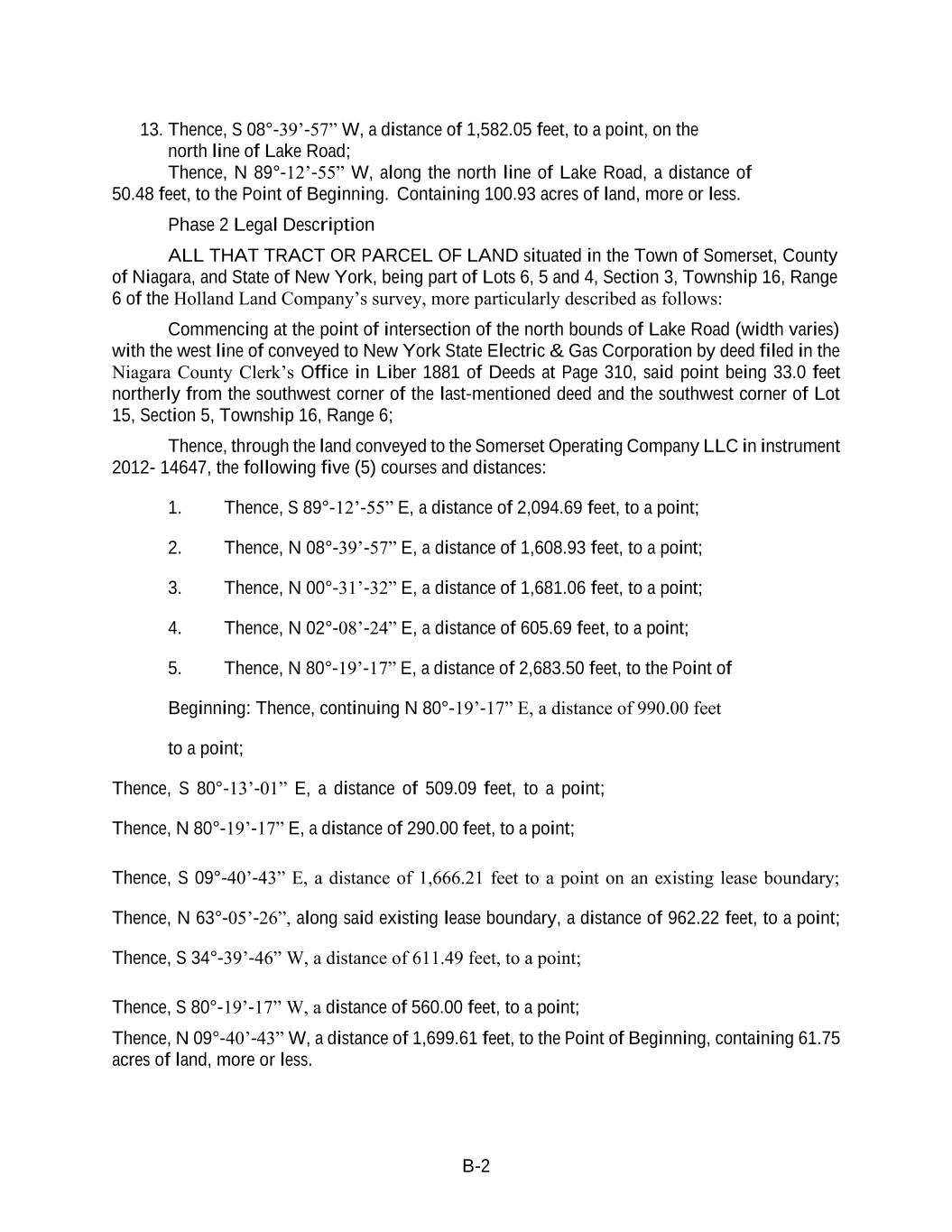 B-2 13. Thence, S 08°-39’-57” W, a distance of 1,582.05 feet, to a point, on the north line of Lake Road; Thence, N 89°-12’-55” W, along the north line of Lake Road, a distance of 50.48 feet, to the Point of Beginning. Containing 100.93 acres of land, more or less. Phase 2 Legal Description ALL THAT TRACT OR PARCEL OF LAND situated in the Town of Somerset, County of Niagara, and State of New York, being part of Lots 6, 5 and 4, Section 3, Township 16, Range 6 of the Holland Land Company’s survey, more particularly described as follows: Commencing at the point of intersection of the north bounds of Lake Road (width varies) with the west line of conveyed to New York State Electric & Gas Corporation by deed filed in the Niagara County Clerk’s Office in Liber 1881 of Deeds at Page 310, said point being 33.0 feet northerly from the southwest corner of the last-mentioned deed and the southwest corner of Lot 15, Section 5, Township 16, Range 6; Thence, through the land conveyed to the Somerset Operating Company LLC in instrument 2012- 14647, the following five (5) courses and distances: 1. Thence, S 89°-12’-55” E, a distance of 2,094.69 feet, to a point; 2. Thence, N 08°-39’-57” E, a distance of 1,608.93 feet, to a point; 3. Thence, N 00°-31’-32” E, a distance of 1,681.06 feet, to a point; 4. Thence, N 02°-08’-24” E, a distance of 605.69 feet, to a point; 5. Thence, N 80°-19’-17” E, a distance of 2,683.50 feet, to the Point of Beginning: Thence, continuing N 80°-19’-17” E, a distance of 990.00 feet to a point; Thence, S 80°-13’-01” E, a distance of 509.09 feet, to a point; Thence, N 80°-19’-17” E, a distance of 290.00 feet, to a point; Thence, S 09°-40’-43” E, a distance of 1,666.21 feet to a point on an existing lease boundary; Thence, N 63°-05’-26”, along said existing lease boundary, a distance of 962.22 feet, to a point; Thence, S 34°-39’-46” W, a distance of 611.49 feet, to a point; Thence, S 80°-19’-17” W, a distance of 560.00 feet, to a point; Thence, N 09°-40’-43” W, a distance of 1,699.61 feet, to the Point of Beginning, containing 61.75 acres of land, more or less.
