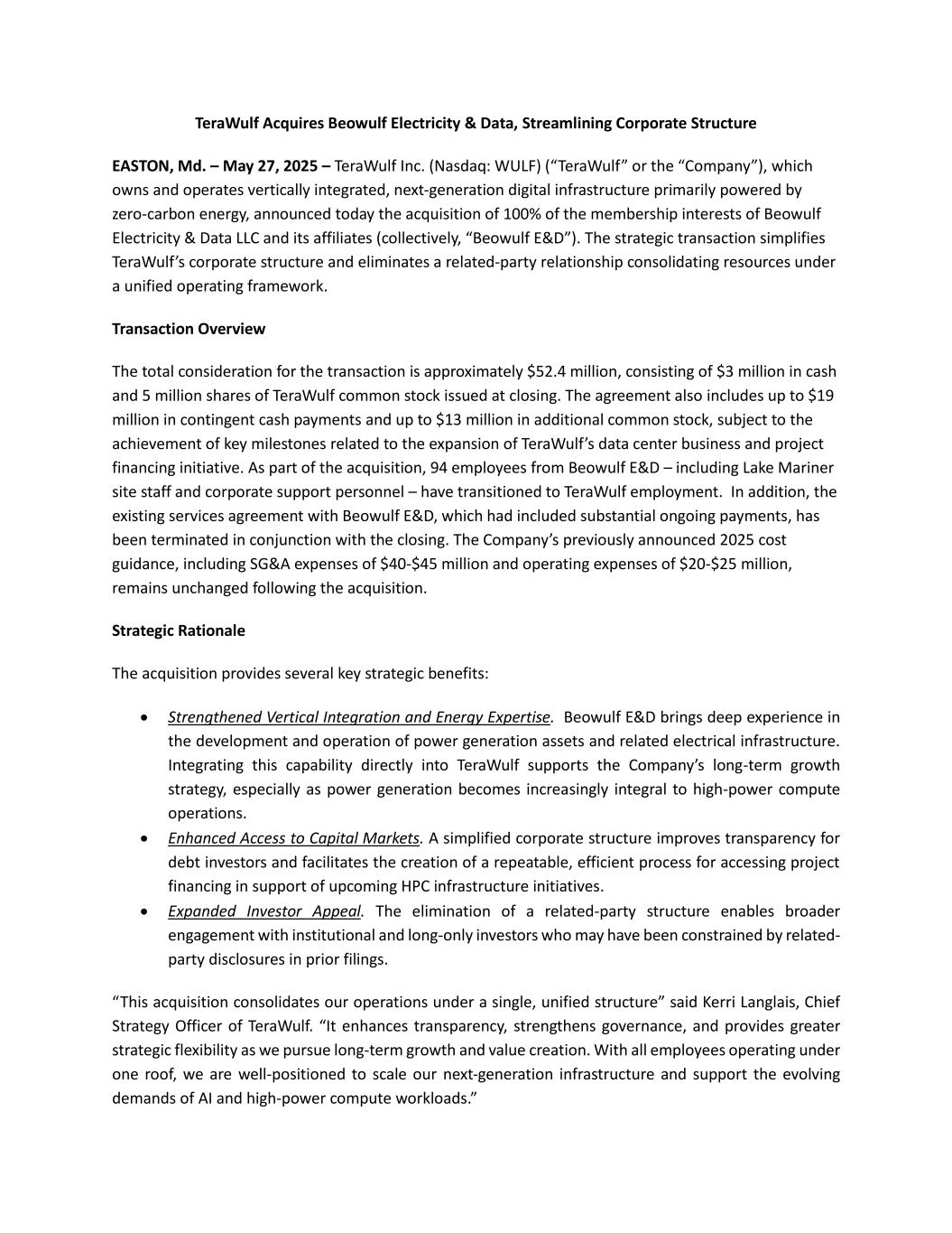 TeraWulf Acquires Beowulf Electricity & Data, Streamlining Corporate Structure EASTON, Md. – May 27, 2025 – TeraWulf Inc. (Nasdaq: WULF) (“TeraWulf” or the “Company”), which owns and operates vertically integrated, next-generation digital infrastructure primarily powered by zero-carbon energy, announced today the acquisition of 100% of the membership interests of Beowulf Electricity & Data LLC and its affiliates (collectively, “Beowulf E&D”). The strategic transaction simplifies TeraWulf’s corporate structure and eliminates a related-party relationship consolidating resources under a unified operating framework. Transaction Overview The total consideration for the transaction is approximately $52.4 million, consisting of $3 million in cash and 5 million shares of TeraWulf common stock issued at closing. The agreement also includes up to $19 million in contingent cash payments and up to $13 million in additional common stock, subject to the achievement of key milestones related to the expansion of TeraWulf’s data center business and project financing initiative. As part of the acquisition, 94 employees from Beowulf E&D – including Lake Mariner site staff and corporate support personnel – have transitioned to TeraWulf employment. In addition, the existing services agreement with Beowulf E&D, which had included substantial ongoing payments, has been terminated in conjunction with the closing. The Company’s previously announced 2025 cost guidance, including SG&A expenses of $40-$45 million and operating expenses of $20-$25 million, remains unchanged following the acquisition. Strategic Rationale The acquisition provides several key strategic benefits: • Strengthened Vertical Integration and Energy Expertise. Beowulf E&D brings deep experience in the development and operation of power generation assets and related electrical infrastructure. Integrating this capability directly into TeraWulf supports the Company’s long-term growth strategy, especially as power generation becomes increasingly integral to high-power compute operations. • Enhanced Access to Capital Markets. A simplified corporate structure improves transparency for debt investors and facilitates the creation of a repeatable, efficient process for accessing project financing in support of upcoming HPC infrastructure initiatives. • Expanded Investor Appeal. The elimination of a related-party structure enables broader engagement with institutional and long-only investors who may have been constrained by related- party disclosures in prior filings. “This acquisition consolidates our operations under a single, unified structure” said Kerri Langlais, Chief Strategy Officer of TeraWulf. “It enhances transparency, strengthens governance, and provides greater strategic flexibility as we pursue long-term growth and value creation. With all employees operating under one roof, we are well-positioned to scale our next-generation infrastructure and support the evolving demands of AI and high-power compute workloads.”