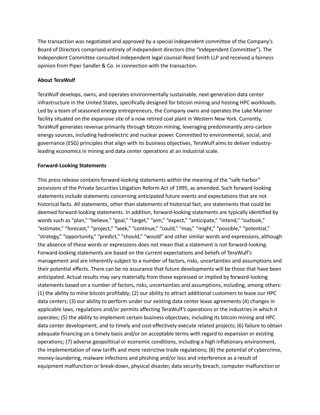 The transaction was negotiated and approved by a special independent committee of the Company’s Board of Directors comprised entirely of independent directors (the “Independent Committee”). The Independent Committee consulted independent legal counsel Reed Smith LLP and received a fairness opinion from Piper Sandler & Co. in connection with the transaction. About TeraWulf TeraWulf develops, owns, and operates environmentally sustainable, next-generation data center infrastructure in the United States, specifically designed for bitcoin mining and hosting HPC workloads. Led by a team of seasoned energy entrepreneurs, the Company owns and operates the Lake Mariner facility situated on the expansive site of a now retired coal plant in Western New York. Currently, TeraWulf generates revenue primarily through bitcoin mining, leveraging predominantly zero-carbon energy sources, including hydroelectric and nuclear power. Committed to environmental, social, and governance (ESG) principles that align with its business objectives, TeraWulf aims to deliver industry- leading economics in mining and data center operations at an industrial scale. Forward-Looking Statements This press release contains forward-looking statements within the meaning of the “safe harbor” provisions of the Private Securities Litigation Reform Act of 1995, as amended. Such forward-looking statements include statements concerning anticipated future events and expectations that are not historical facts. All statements, other than statements of historical fact, are statements that could be deemed forward-looking statements. In addition, forward-looking statements are typically identified by words such as “plan,” “believe,” “goal,” “target,” “aim,” “expect,” “anticipate,” “intend,” “outlook,” “estimate,” “forecast,” “project,” “seek,” “continue,” “could,” “may,” “might,” “possible,” “potential,” “strategy,” “opportunity,” “predict,” “should,” “would” and other similar words and expressions, although the absence of these words or expressions does not mean that a statement is not forward-looking. Forward-looking statements are based on the current expectations and beliefs of TeraWulf’s management and are inherently subject to a number of factors, risks, uncertainties and assumptions and their potential effects. There can be no assurance that future developments will be those that have been anticipated. Actual results may vary materially from those expressed or implied by forward-looking statements based on a number of factors, risks, uncertainties and assumptions, including, among others: (1) the ability to mine bitcoin profitably; (2) our ability to attract additional customers to lease our HPC data centers; (3) our ability to perform under our existing data center lease agreements (4) changes in applicable laws, regulations and/or permits affecting TeraWulf’s operations or the industries in which it operates; (5) the ability to implement certain business objectives, including its bitcoin mining and HPC data center development, and to timely and cost-effectively execute related projects; (6) failure to obtain adequate financing on a timely basis and/or on acceptable terms with regard to expansion or existing operations; (7) adverse geopolitical or economic conditions, including a high inflationary environment, the implementation of new tariffs and more restrictive trade regulations; (8) the potential of cybercrime, money-laundering, malware infections and phishing and/or loss and interference as a result of equipment malfunction or break-down, physical disaster, data security breach, computer malfunction or