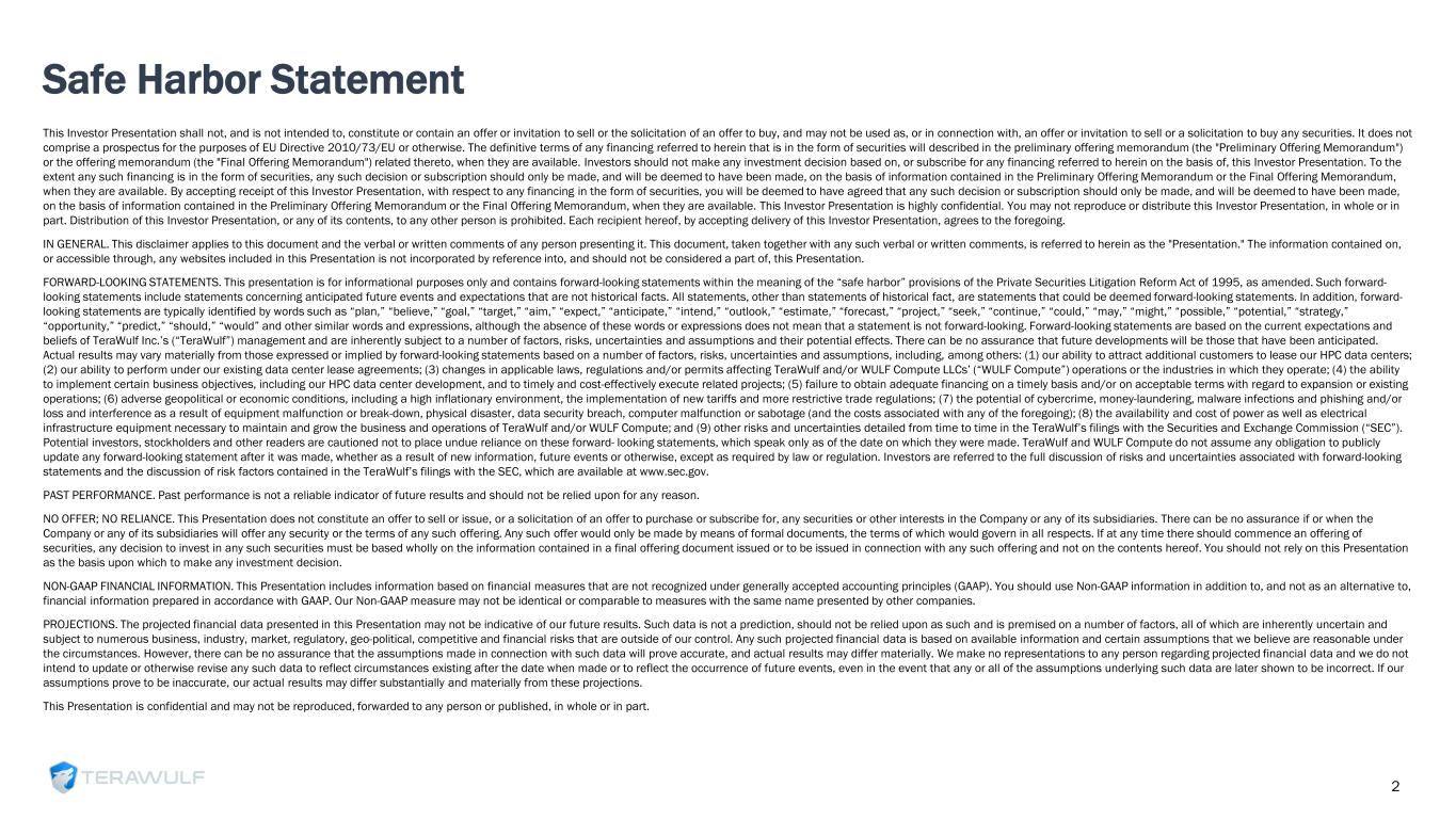 2 Safe Harbor Statement This Investor Presentation shall not, and is not intended to, constitute or contain an offer or invitation to sell or the solicitation of an offer to buy, and may not be used as, or in connection with, an offer or invitation to sell or a solicitation to buy any securities. It does not comprise a prospectus for the purposes of EU Directive 2010/73/EU or otherwise. The definitive terms of any financing referred to herein that is in the form of securities will described in the preliminary offering memorandum (the "Preliminary Offering Memorandum") or the offering memorandum (the "Final Offering Memorandum") related thereto, when they are available. Investors should not make any investment decision based on, or subscribe for any financing referred to herein on the basis of, this Investor Presentation. To the extent any such financing is in the form of securities, any such decision or subscription should only be made, and will be deemed to have been made, on the basis of information contained in the Preliminary Offering Memorandum or the Final Offering Memorandum, when they are available. By accepting receipt of this Investor Presentation, with respect to any financing in the form of securities, you will be deemed to have agreed that any such decision or subscription should only be made, and will be deemed to have been made, on the basis of information contained in the Preliminary Offering Memorandum or the Final Offering Memorandum, when they are available. This Investor Presentation is highly confidential. You may not reproduce or distribute this Investor Presentation, in whole or in part. Distribution of this Investor Presentation, or any of its contents, to any other person is prohibited. Each recipient hereof, by accepting delivery of this Investor Presentation, agrees to the foregoing. IN GENERAL. This disclaimer applies to this document and the verbal or written comments of any person presenting it. This document, taken together with any such verbal or written comments, is referred to herein as the "Presentation." The information contained on, or accessible through, any websites included in this Presentation is not incorporated by reference into, and should not be considered a part of, this Presentation. FORWARD-LOOKING STATEMENTS. This presentation is for informational purposes only and contains forward-looking statements within the meaning of the “safe harbor” provisions of the Private Securities Litigation Reform Act of 1995, as amended. Such forward- looking statements include statements concerning anticipated future events and expectations that are not historical facts. All statements, other than statements of historical fact, are statements that could be deemed forward-looking statements. In addition, forward- looking statements are typically identified by words such as “plan,” “believe,” “goal,” “target,” “aim,” “expect,” “anticipate,” “intend,” “outlook,” “estimate,” “forecast,” “project,” “seek,” “continue,” “could,” “may,” “might,” “possible,” “potential,” “strategy,” “opportunity,” “predict,” “should,” “would” and other similar words and expressions, although the absence of these words or expressions does not mean that a statement is not forward-looking. Forward-looking statements are based on the current expectations and beliefs of TeraWulf Inc.’s (“TeraWulf”) management and are inherently subject to a number of factors, risks, uncertainties and assumptions and their potential effects. There can be no assurance that future developments will be those that have been anticipated. Actual results may vary materially from those expressed or implied by forward-looking statements based on a number of factors, risks, uncertainties and assumptions, including, among others: (1) our ability to attract additional customers to lease our HPC data centers; (2) our ability to perform under our existing data center lease agreements; (3) changes in applicable laws, regulations and/or permits affecting TeraWulf and/or WULF Compute LLCs’ (“WULF Compute”) operations or the industries in which they operate; (4) the ability to implement certain business objectives, including our HPC data center development, and to timely and cost-effectively execute related projects; (5) failure to obtain adequate financing on a timely basis and/or on acceptable terms with regard to expansion or existing operations; (6) adverse geopolitical or economic conditions, including a high inflationary environment, the implementation of new tariffs and more restrictive trade regulations; (7) the potential of cybercrime, money-laundering, malware infections and phishing and/or loss and interference as a result of equipment malfunction or break-down, physical disaster, data security breach, computer malfunction or sabotage (and the costs associated with any of the foregoing); (8) the availability and cost of power as well as electrical infrastructure equipment necessary to maintain and grow the business and operations of TeraWulf and/or WULF Compute; and (9) other risks and uncertainties detailed from time to time in the TeraWulf’s filings with the Securities and Exchange Commission (“SEC”). Potential investors, stockholders and other readers are cautioned not to place undue reliance on these forward- looking statements, which speak only as of the date on which they were made. TeraWulf and WULF Compute do not assume any obligation to publicly update any forward-looking statement after it was made, whether as a result of new information, future events or otherwise, except as required by law or regulation. Investors are referred to the full discussion of risks and uncertainties associated with forward-looking statements and the discussion of risk factors contained in the TeraWulf’s filings with the SEC, which are available at www.sec.gov. PAST PERFORMANCE. Past performance is not a rel