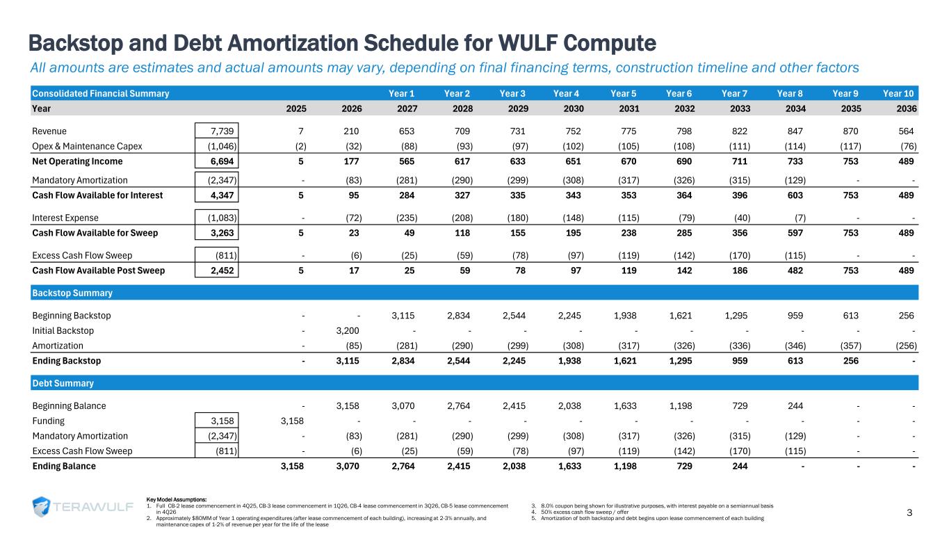 3 Consolidated Financial Summary Year 1 Year 2 Year 3 Year 4 Year 5 Year 6 Year 7 Year 8 Year 9 Year 10 Year 2025 2026 2027 2028 2029 2030 2031 2032 2033 2034 2035 2036 Revenue 7,739 7 210 653 709 731 752 775 798 822 847 870 564 Opex & Maintenance Capex (1,046) (2) (32) (88) (93) (97) (102) (105) (108) (111) (114) (117) (76) Net Operating Income 6,694 5 177 565 617 633 651 670 690 711 733 753 489 Mandatory Amortization (2,347) - (83) (281) (290) (299) (308) (317) (326) (315) (129) - - Cash Flow Available for Interest 4,347 5 95 284 327 335 343 353 364 396 603 753 489 Interest Expense (1,083) - (72) (235) (208) (180) (148) (115) (79) (40) (7) - - Cash Flow Available for Sweep 3,263 5 23 49 118 155 195 238 285 356 597 753 489 Excess Cash Flow Sweep (811) - (6) (25) (59) (78) (97) (119) (142) (170) (115) - - Cash Flow Available Post Sweep 2,452 5 17 25 59 78 97 119 142 186 482 753 489 Backstop Summary Beginning Backstop - - 3,115 2,834 2,544 2,245 1,938 1,621 1,295 959 613 256 Initial Backstop - 3,200 - - - - - - - - - - Amortization - (85) (281) (290) (299) (308) (317) (326) (336) (346) (357) (256) Ending Backstop - 3,115 2,834 2,544 2,245 1,938 1,621 1,295 959 613 256 - Debt Summary Beginning Balance - 3,158 3,070 2,764 2,415 2,038 1,633 1,198 729 244 - - Funding 3,158 3,158 - - - - - - - - - - - Mandatory Amortization (2,347) - (83) (281) (290) (299) (308) (317) (326) (315) (129) - - Excess Cash Flow Sweep (811) - (6) (25) (59) (78) (97) (119) (142) (170) (115) - - Ending Balance 3,158 3,070 2,764 2,415 2,038 1,633 1,198 729 244 - - - Backstop and Debt Amortization Schedule for WULF Compute Key Model Assumptions: 1. Full CB-2 lease commencement in 4Q25, CB-3 lease commencement in 1Q26, CB-4 lease commencement in 3Q26, CB-5 lease commencement in 4Q26 2. Approximately $80MM of Year 1 operating expenditures (after lease commencement of each building), increasing at 2-3% annually, and maintenance capex of 1-2% of revenue per year for the life of the lease 3. 8.0% coupon being shown for illustrative purposes, with interest payable on a semiannual basis 4. 50% excess cash flow sweep / offer 5. Amortization of both backstop and debt begins upon lease commencement of each building All amounts are estimates and actual amounts may vary, depending on final financing terms, construction timeline and other factors