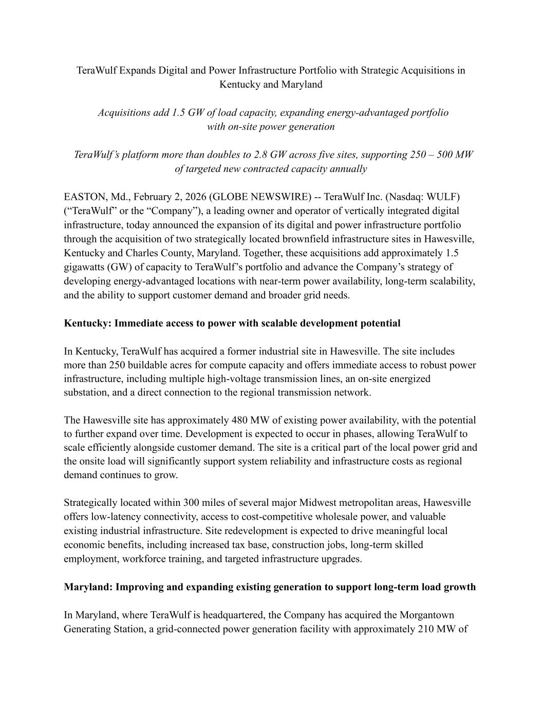 TeraWulf Expands Digital and Power Infrastructure Portfolio with Strategic Acquisitions in Kentucky and Maryland Acquisitions add 1.5 GW of load capacity, expanding energy-advantaged portfolio with on-site power generation TeraWulf’s platform more than doubles to 2.8 GW across five sites, supporting 250 – 500 MW of targeted new contracted capacity annually EASTON, Md., February 2, 2026 (GLOBE NEWSWIRE) -- TeraWulf Inc. (Nasdaq: WULF) (“TeraWulf” or the “Company”), a leading owner and operator of vertically integrated digital infrastructure, today announced the expansion of its digital and power infrastructure portfolio through the acquisition of two strategically located brownfield infrastructure sites in Hawesville, Kentucky and Charles County, Maryland. Together, these acquisitions add approximately 1.5 gigawatts (GW) of capacity to TeraWulf’s portfolio and advance the Company’s strategy of developing energy-advantaged locations with near-term power availability, long-term scalability, and the ability to support customer demand and broader grid needs. Kentucky: Immediate access to power with scalable development potential In Kentucky, TeraWulf has acquired a former industrial site in Hawesville. The site includes more than 250 buildable acres for compute capacity and offers immediate access to robust power infrastructure, including multiple high-voltage transmission lines, an on-site energized substation, and a direct connection to the regional transmission network. The Hawesville site has approximately 480 MW of existing power availability, with the potential to further expand over time. Development is expected to occur in phases, allowing TeraWulf to scale efficiently alongside customer demand. The site is a critical part of the local power grid and the onsite load will significantly support system reliability and infrastructure costs as regional demand continues to grow. Strategically located within 300 miles of several major Midwest metropolitan areas, Hawesville offers low-latency connectivity, access to cost-competitive wholesale power, and valuable existing industrial infrastructure. Site redevelopment is expected to drive meaningful local economic benefits, including increased tax base, construction jobs, long-term skilled employment, workforce training, and targeted infrastructure upgrades. Maryland: Improving and expanding existing generation to support long-term load growth In Maryland, where TeraWulf is headquartered, the Company has acquired the Morgantown Generating Station, a grid-connected power generation facility with approximately 210 MW of