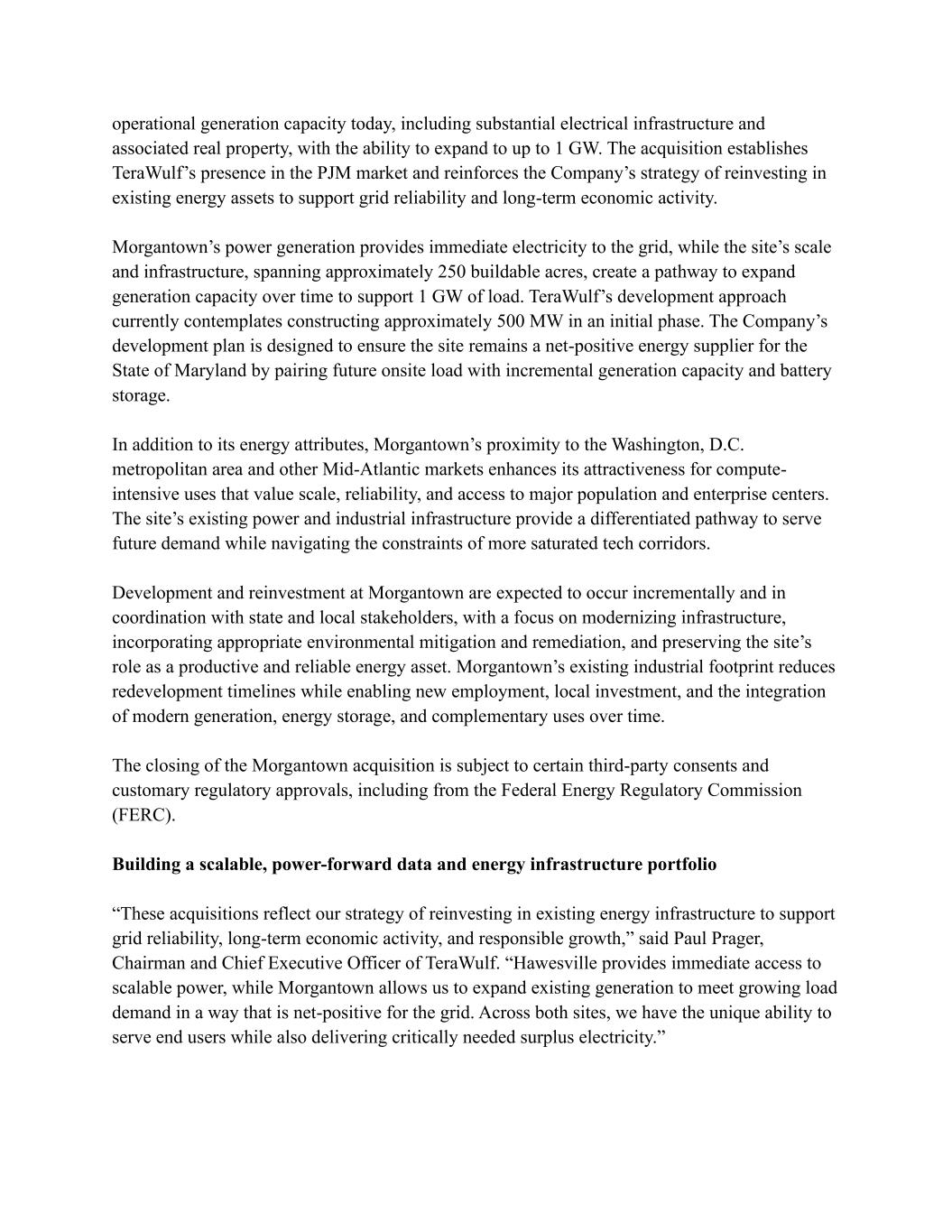 operational generation capacity today, including substantial electrical infrastructure and associated real property, with the ability to expand to up to 1 GW. The acquisition establishes TeraWulf’s presence in the PJM market and reinforces the Company’s strategy of reinvesting in existing energy assets to support grid reliability and long-term economic activity. Morgantown’s power generation provides immediate electricity to the grid, while the site’s scale and infrastructure, spanning approximately 250 buildable acres, create a pathway to expand generation capacity over time to support 1 GW of load. TeraWulf’s development approach currently contemplates constructing approximately 500 MW in an initial phase. The Company’s development plan is designed to ensure the site remains a net-positive energy supplier for the State of Maryland by pairing future onsite load with incremental generation capacity and battery storage. In addition to its energy attributes, Morgantown’s proximity to the Washington, D.C. metropolitan area and other Mid-Atlantic markets enhances its attractiveness for compute- intensive uses that value scale, reliability, and access to major population and enterprise centers. The site’s existing power and industrial infrastructure provide a differentiated pathway to serve future demand while navigating the constraints of more saturated tech corridors. Development and reinvestment at Morgantown are expected to occur incrementally and in coordination with state and local stakeholders, with a focus on modernizing infrastructure, incorporating appropriate environmental mitigation and remediation, and preserving the site’s role as a productive and reliable energy asset. Morgantown’s existing industrial footprint reduces redevelopment timelines while enabling new employment, local investment, and the integration of modern generation, energy storage, and complementary uses over time. The closing of the Morgantown acquisition is subject to certain third-party consents and customary regulatory approvals, including from the Federal Energy Regulatory Commission (FERC). Building a scalable, power-forward data and energy infrastructure portfolio “These acquisitions reflect our strategy of reinvesting in existing energy infrastructure to support grid reliability, long-term economic activity, and responsible growth,” said Paul Prager, Chairman and Chief Executive Officer of TeraWulf. “Hawesville provides immediate access to scalable power, while Morgantown allows us to expand existing generation to meet growing load demand in a way that is net-positive for the grid. Across both sites, we have the unique ability to serve end users while also delivering critically needed surplus electricity.”