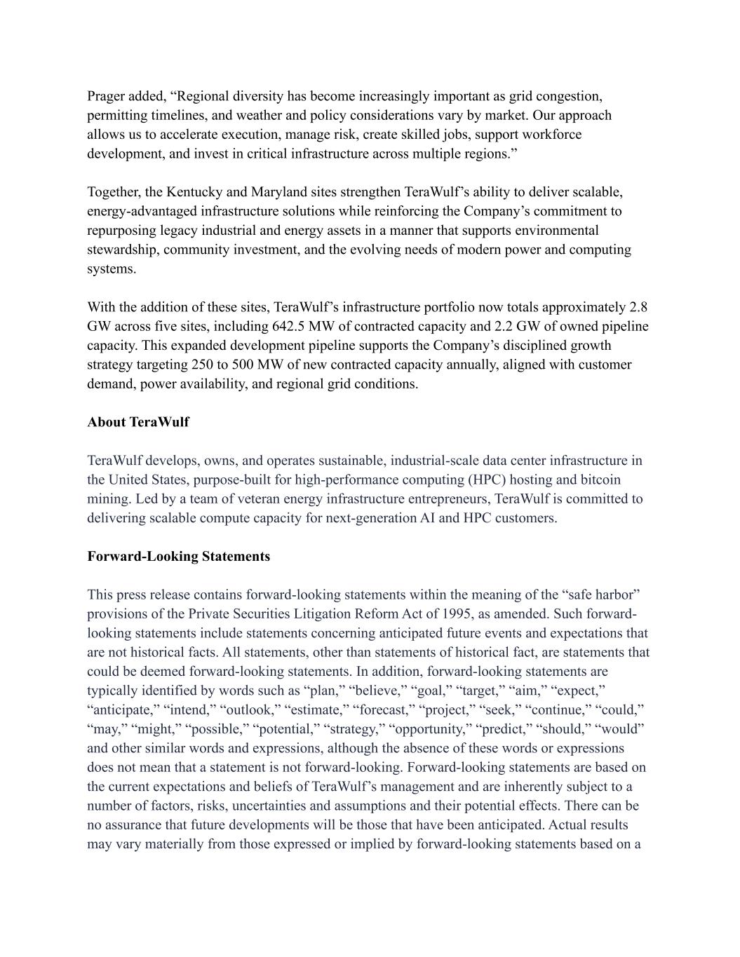 Prager added, “Regional diversity has become increasingly important as grid congestion, permitting timelines, and weather and policy considerations vary by market. Our approach allows us to accelerate execution, manage risk, create skilled jobs, support workforce development, and invest in critical infrastructure across multiple regions.” Together, the Kentucky and Maryland sites strengthen TeraWulf’s ability to deliver scalable, energy-advantaged infrastructure solutions while reinforcing the Company’s commitment to repurposing legacy industrial and energy assets in a manner that supports environmental stewardship, community investment, and the evolving needs of modern power and computing systems. With the addition of these sites, TeraWulf’s infrastructure portfolio now totals approximately 2.8 GW across five sites, including 642.5 MW of contracted capacity and 2.2 GW of owned pipeline capacity. This expanded development pipeline supports the Company’s disciplined growth strategy targeting 250 to 500 MW of new contracted capacity annually, aligned with customer demand, power availability, and regional grid conditions. About TeraWulf TeraWulf develops, owns, and operates sustainable, industrial-scale data center infrastructure in the United States, purpose-built for high-performance computing (HPC) hosting and bitcoin mining. Led by a team of veteran energy infrastructure entrepreneurs, TeraWulf is committed to delivering scalable compute capacity for next-generation AI and HPC customers. Forward-Looking Statements This press release contains forward-looking statements within the meaning of the “safe harbor” provisions of the Private Securities Litigation Reform Act of 1995, as amended. Such forward- looking statements include statements concerning anticipated future events and expectations that are not historical facts. All statements, other than statements of historical fact, are statements that could be deemed forward-looking statements. In addition, forward-looking statements are typically identified by words such as “plan,” “believe,” “goal,” “target,” “aim,” “expect,” “anticipate,” “intend,” “outlook,” “estimate,” “forecast,” “project,” “seek,” “continue,” “could,” “may,” “might,” “possible,” “potential,” “strategy,” “opportunity,” “predict,” “should,” “would” and other similar words and expressions, although the absence of these words or expressions does not mean that a statement is not forward-looking. Forward-looking statements are based on the current expectations and beliefs of TeraWulf’s management and are inherently subject to a number of factors, risks, uncertainties and assumptions and their potential effects. There can be no assurance that future developments will be those that have been anticipated. Actual results may vary materially from those expressed or implied by forward-looking statements based on a