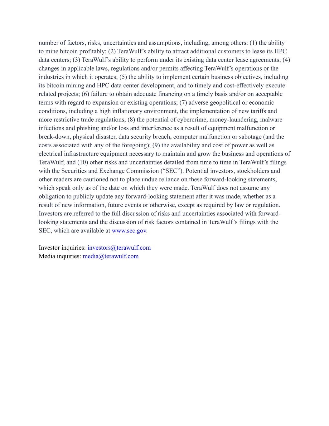 number of factors, risks, uncertainties and assumptions, including, among others: (1) the ability to mine bitcoin profitably; (2) TeraWulf’s ability to attract additional customers to lease its HPC data centers; (3) TeraWulf’s ability to perform under its existing data center lease agreements; (4) changes in applicable laws, regulations and/or permits affecting TeraWulf’s operations or the industries in which it operates; (5) the ability to implement certain business objectives, including its bitcoin mining and HPC data center development, and to timely and cost-effectively execute related projects; (6) failure to obtain adequate financing on a timely basis and/or on acceptable terms with regard to expansion or existing operations; (7) adverse geopolitical or economic conditions, including a high inflationary environment, the implementation of new tariffs and more restrictive trade regulations; (8) the potential of cybercrime, money-laundering, malware infections and phishing and/or loss and interference as a result of equipment malfunction or break-down, physical disaster, data security breach, computer malfunction or sabotage (and the costs associated with any of the foregoing); (9) the availability and cost of power as well as electrical infrastructure equipment necessary to maintain and grow the business and operations of TeraWulf; and (10) other risks and uncertainties detailed from time to time in TeraWulf’s filings with the Securities and Exchange Commission (“SEC”). Potential investors, stockholders and other readers are cautioned not to place undue reliance on these forward-looking statements, which speak only as of the date on which they were made. TeraWulf does not assume any obligation to publicly update any forward-looking statement after it was made, whether as a result of new information, future events or otherwise, except as required by law or regulation. Investors are referred to the full discussion of risks and uncertainties associated with forward- looking statements and the discussion of risk factors contained in TeraWulf’s filings with the SEC, which are available at www.sec.gov. Investor inquiries: investors@terawulf.com Media inquiries: media@terawulf.com