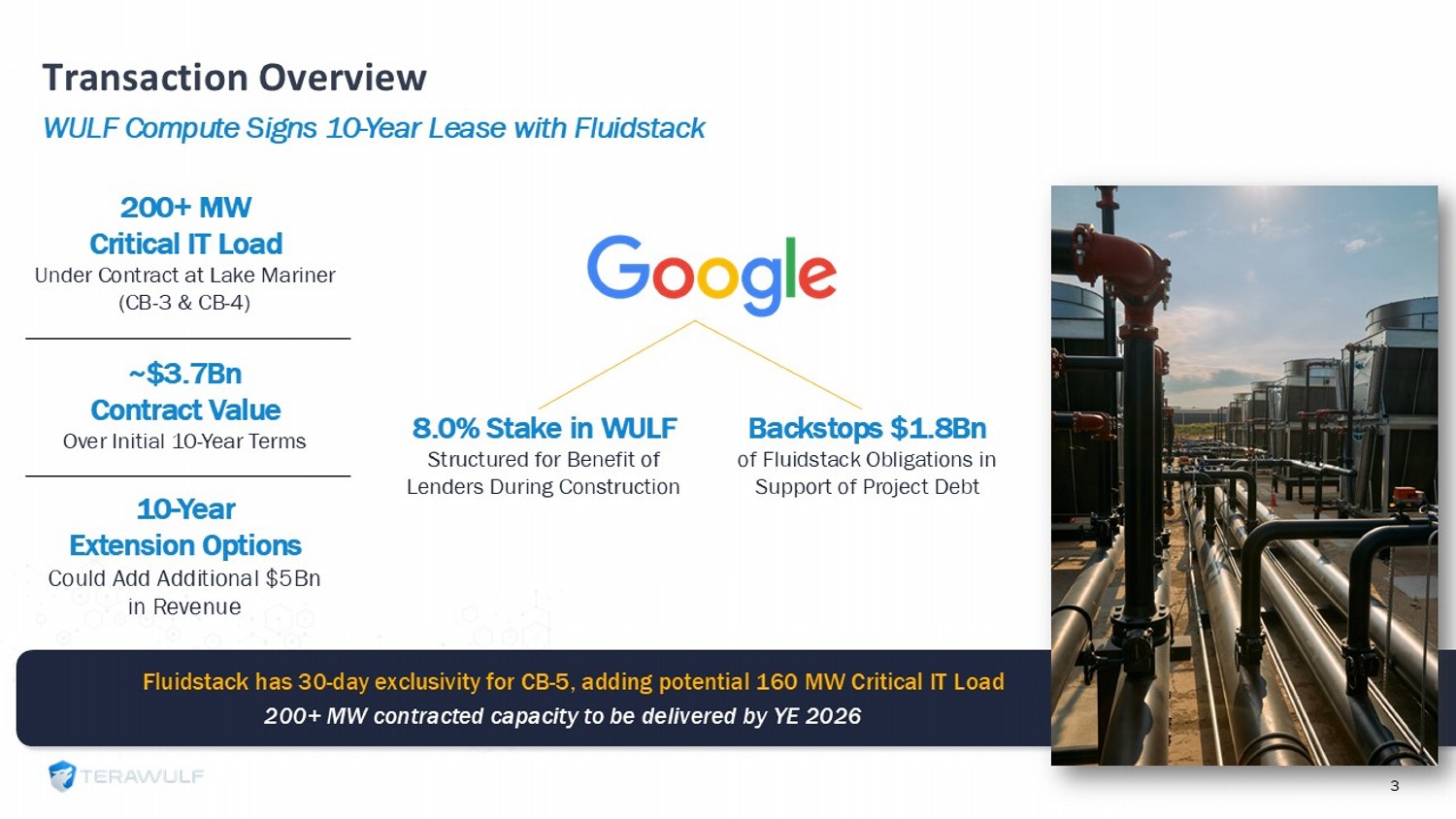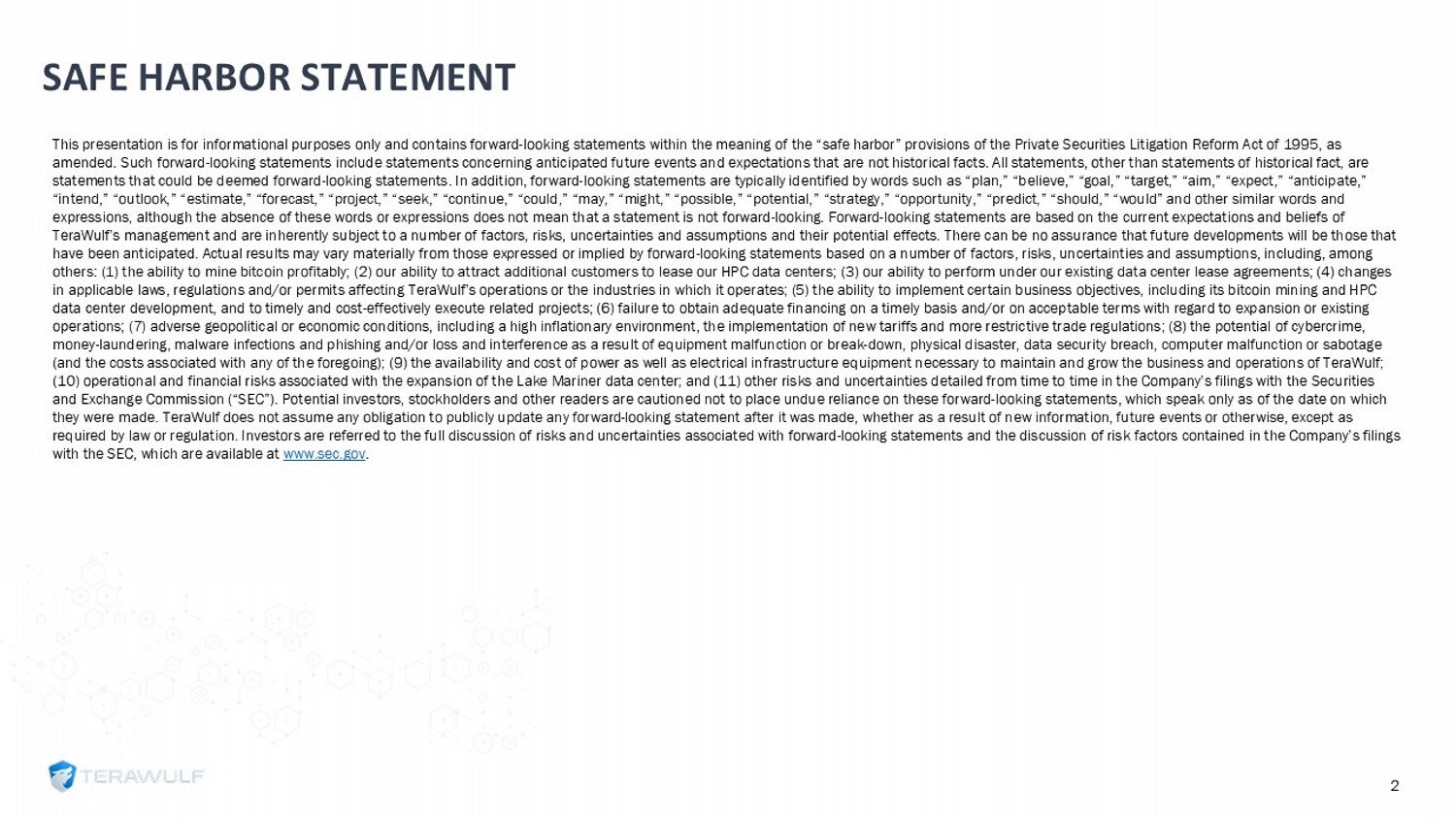 SAFE HARBOR STATEMENT This presentation is for informational purposes only and contains forward - looking statements within the meaning of the “safe har bor” provisions of the Private Securities Litigation Reform Act of 1995, as amended. Such forward - looking statements include statements concerning anticipated future events and expectations that are not h istorical facts. All statements, other than statements of historical fact, are statements that could be deemed forward - looking statements. In addition, forward - looking statements are typically identified by words such as “plan,” “believe,” “goal,” “target,” “aim,” “expect,” “anticipate,” “intend,” “outlook,” “estimate,” “forecast,” “project,” “seek,” “continue,” “could,” “may,” “might,” “possible,” “potential,” “s trategy,” “opportunity,” “predict,” “should,” “would” and other similar words and expressions, although the absence of these words or expressions does not mean that a statement is not forward - looking. Forward - l ooking statements are based on the current expectations and beliefs of TeraWulf’s management and are inherently subject to a number of factors, risks, uncertainties and assumptions and their potential effect s. There can be no assurance that future developments will be those that have been anticipated. Actual results may vary materially from those expressed or implied by forward - looking statements based on a number of factors, risks, uncertainties and assumptions, including, among others: (1) the ability to mine bitcoin profitably; (2) our ability to attract additional customers to lease our HPC data cen ter s; (3) our ability to perform under our existing data center lease agreements; (4) changes in applicable laws, regulations and/or permits affecting TeraWulf’s operations or the industries in which it operates; (5) the ability to implement certain business objectives, including its bi tc oin mining and HPC data center development, and to timely and cost - effectively execute related projects; (6) failure to obtain adequate financing o n a timely basis and/or on acceptable terms with regard to expansion or existing operations; (7) adverse geopolitical or economic conditions, including a high inflationary environment, the implementation of ne w tariffs and more restrictive trade regulations; (8) the potential of cybercrime, money - laundering, malware infections and phishing and/or loss and interference as a result of equipment malfunction or break - dow n, physical disaster, data security breach, computer malfunction or sabotage (and the costs associated with any of the foregoing); (9) the availability and cost of power as well as electrical infrastruc tur e equipment necessary to maintain and grow the business and operations of TeraWulf ; (10) operational and financial risks associated with the expansion of the Lake Mariner data center; and (11) other risks and unc ertainties detailed from time to time in the Company’s filings with the Securities and Exchange Commission (“SEC”). Potential investors, stockholders and other readers are cautioned not to place undue relianc e o n these forward - looking statements, which speak only as of the date on which they were made. TeraWulf does not assume any obligation to publicly update any forward - looking statement after it was made, whether as a result of new i nformation, future events or otherwise, except as required by law or regulation. Investors are referred to the full discussion of risks and uncertainties associated with forwa rd - looking statements and the discussion of risk factors contained in the Company’s filings with the SEC, which are available at www.sec.gov . 2