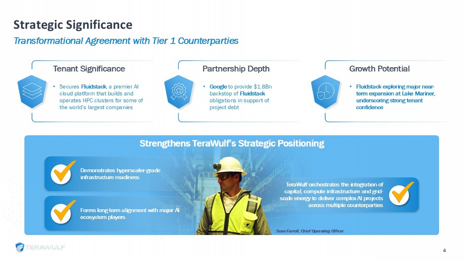 Transaction Overview WULF Compute Signs 10 - Year Lease with Fluidstack Fluidstack has 30 - day exclusivity for CB - 5, adding potential 160 MW Critical IT Load 200+ MW contracted capacity to be delivered by YE 202 6 3 200+ MW Critical IT Load Under Contract at Lake Mariner (CB - 3 & CB - 4) ~$3.7Bn Contract Value Over Initial 10 - Year Terms 10 - Year Extension Options Could Add Additional $5Bn in Revenue Backstops $1.8Bn o f Fluidstack Obligations in Support of Project Debt 8.0% Stake in WULF Structured for Benefit of Lenders During Construction