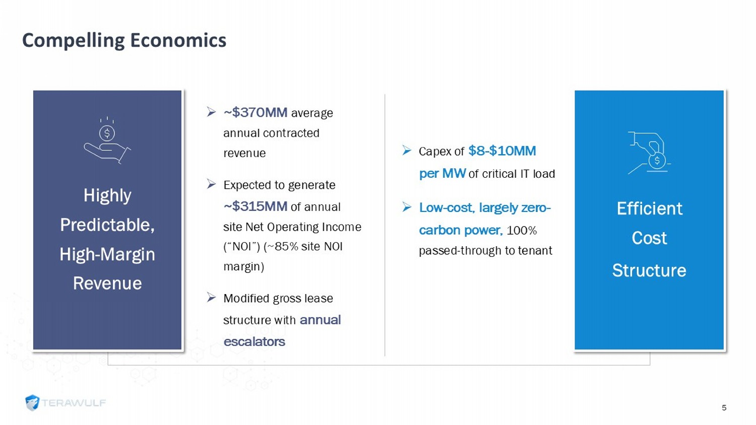 Strategic Significance Transformational Agreement with Tier 1 Counterparties 4 Demonstrates hyperscaler - grade infrastructure readiness TeraWulf orchestrates the integration of capital, compute infrastructure and grid - scale energy to deliver complex AI projects across multiple counterparties Strengthens TeraWulf’s Strategic Positioning • Secures Fluidstack , a premier AI cloud platform that builds and operates HPC clusters for some of the world’s largest companies • Google to provide $1.8Bn backstop of Fluidstack obligations in support of project debt • Fluidstack exploring major near - term expansion at Lake Mariner, underscoring strong tenant confidence Tenant Significance Partnership Depth Growth Potential Forms long - term alignment with major AI ecosystem players Sean Farrell, Chief Operating Officer