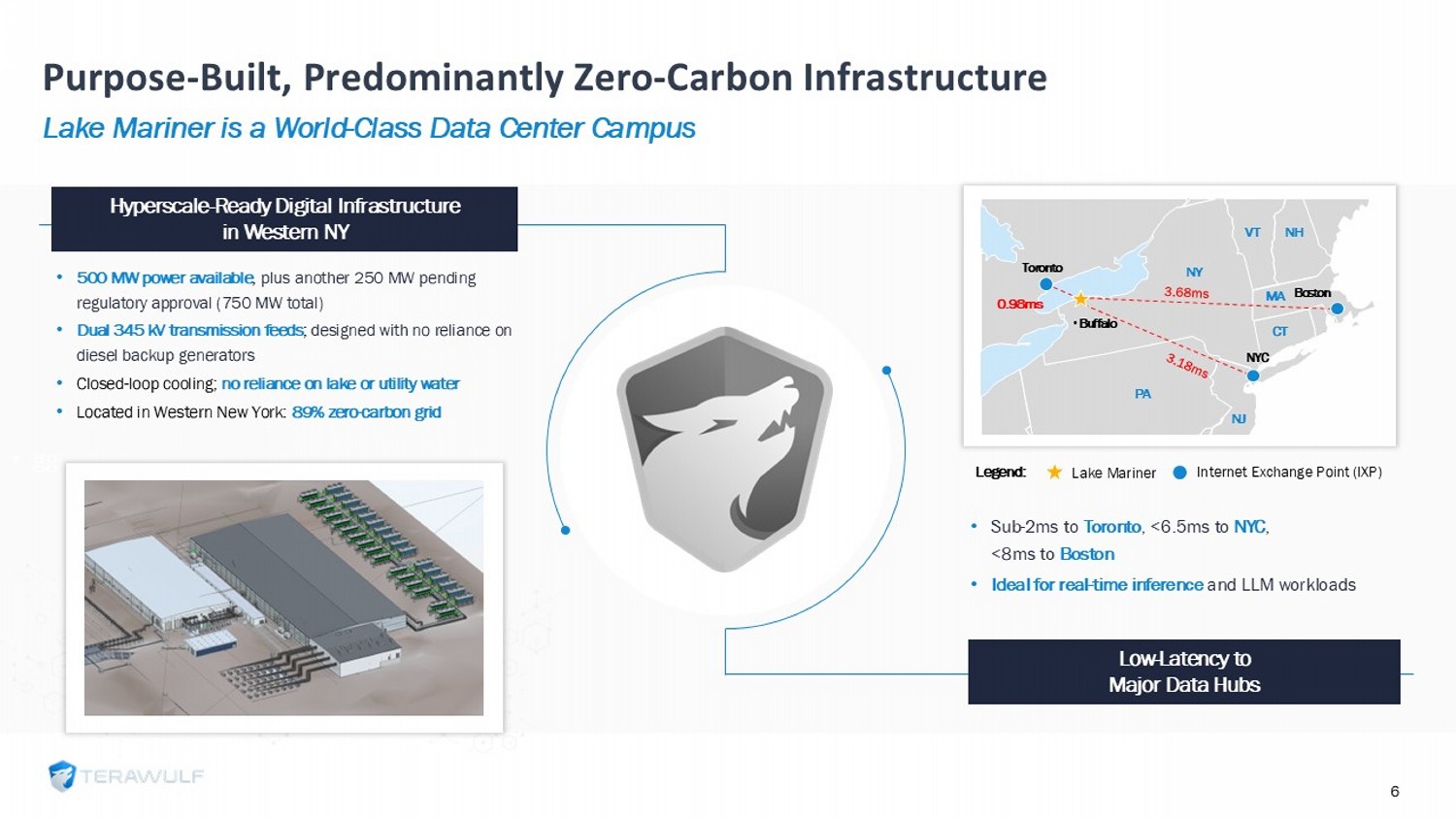 Purpose - Built, Predominantly Zero - Carbon Infrastructure Lake Mariner is a World - Class Data Center Campus 6 • gg • 500 MW power available , plus another 250 MW pending regulatory approval (750 MW total) • Dual 345 kV transmission feeds ; designed with no reliance on diesel backup generators • Closed - loop cooling; no reliance on lake or utility water • Located in Western New York: 89% zero - carbon grid • Sub - 2ms to Toronto , <6.5ms to NYC , <8ms to Boston • Ideal for real - time inference and LLM workloads Legend: Lake Mariner Internet Exchange Point (IXP) Toronto • Buffalo Boston VT NH MA CT NYC PA NJ NY 0.98ms Hyperscale - Ready Digital Infrastructure in Western NY Low - Latency to Major Data Hubs
