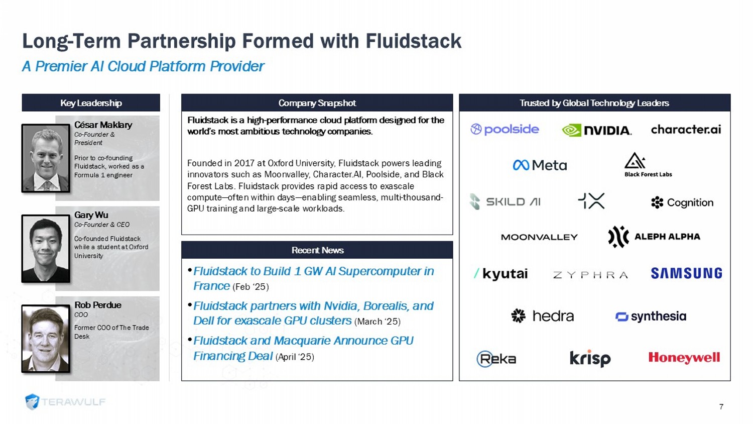 Fluidstack is a high - performance cloud platform designed for the world’s most ambitious technology companies. Founded in 2017 at Oxford University, Fluidstack powers leading innovators such as Moonvalley , Character.AI, Poolside, and Black Forest Labs. Fluidstack provides rapid access to exascale compute — often within days — enabling seamless, multi - thousand - GPU training and large - scale workloads . Long - Term Partnership Formed with Fluidstack A Premier AI Cloud Platform Provider 7 Key Leadership • Fluidstack to Build 1 GW AI Supercomputer in France ( Feb ‘25) • Fluidstack partners with Nvidia, Borealis, and Dell for exascale GPU clusters (March ‘25) • Fluidstack and Macquarie Announce GPU Financing Deal (April ‘25) Company Snapshot Recent News Trusted by Global Technology Leaders César Maklary Co - Founder & President Prior to co - founding Fluidstack, worked as a Formula 1 engineer Rob Perdue COO Former COO of The Trade Desk Gary Wu Co - Founder & CEO Co - founded Fluidstack while a student at Oxford University