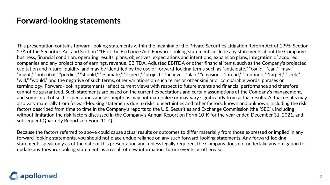 This presentation contains forward-looking statements within the meaning of the Private Securities Litigation Reform Act of 1995, Section 27A of the Securities Act and Section 21E of the Exchange Act. Forward-looking statements include any statements about the Company's business, financial condition, operating results, plans, objectives, expectations and intentions, expansion plans, integration of acquired companies and any projections of earnings, revenue, EBITDA, Adjusted EBITDA or other financial items, such as the Company's projected capitation and future liquidity, and may be identified by the use of forward-looking terms such as “anticipate,” “could,” “can,” “may,” “might,” “potential,” “predict,” “should,” “estimate,” “expect,” “project,” “believe,” “plan,” “envision,” “intend,” “continue,” “target,” “seek,” “will,” “would,” and the negative of such terms, other variations on such terms or other similar or comparable words, phrases or terminology. Forward-looking statements reflect current views with respect to future events and financial performance and therefore cannot be guaranteed. Such statements are based on the current expectations and certain assumptions of the Company's management, and some or all of such expectations and assumptions may not materialize or may vary significantly from actual results. Actual results may also vary materially from forward-looking statements due to risks, uncertainties and other factors, known and unknown, including the risk factors described from time to time in the Company’s reports to the U.S. Securities and Exchange Commission (the “SEC”), including without limitation the risk factors discussed in the Company's Annual Report on Form 10-K for the year ended December 31, 2021, and subsequent Quarterly Reports on Form 10-Q. Because the factors referred to above could cause actual results or outcomes to differ materially from those expressed or implied in any forward-looking statements, you should not place undue reliance on any such forward-looking statements. Any forward-looking statements speak only as of the date of this presentation and, unless legally required, the Company does not undertake any obligation to update any forward-looking statement, as a result of new information, future events or otherwise. Forward-looking statements 2