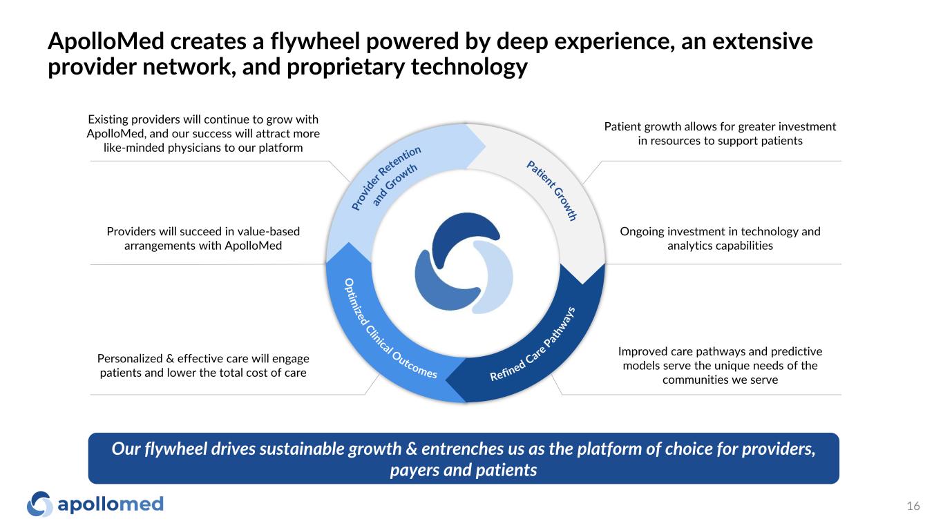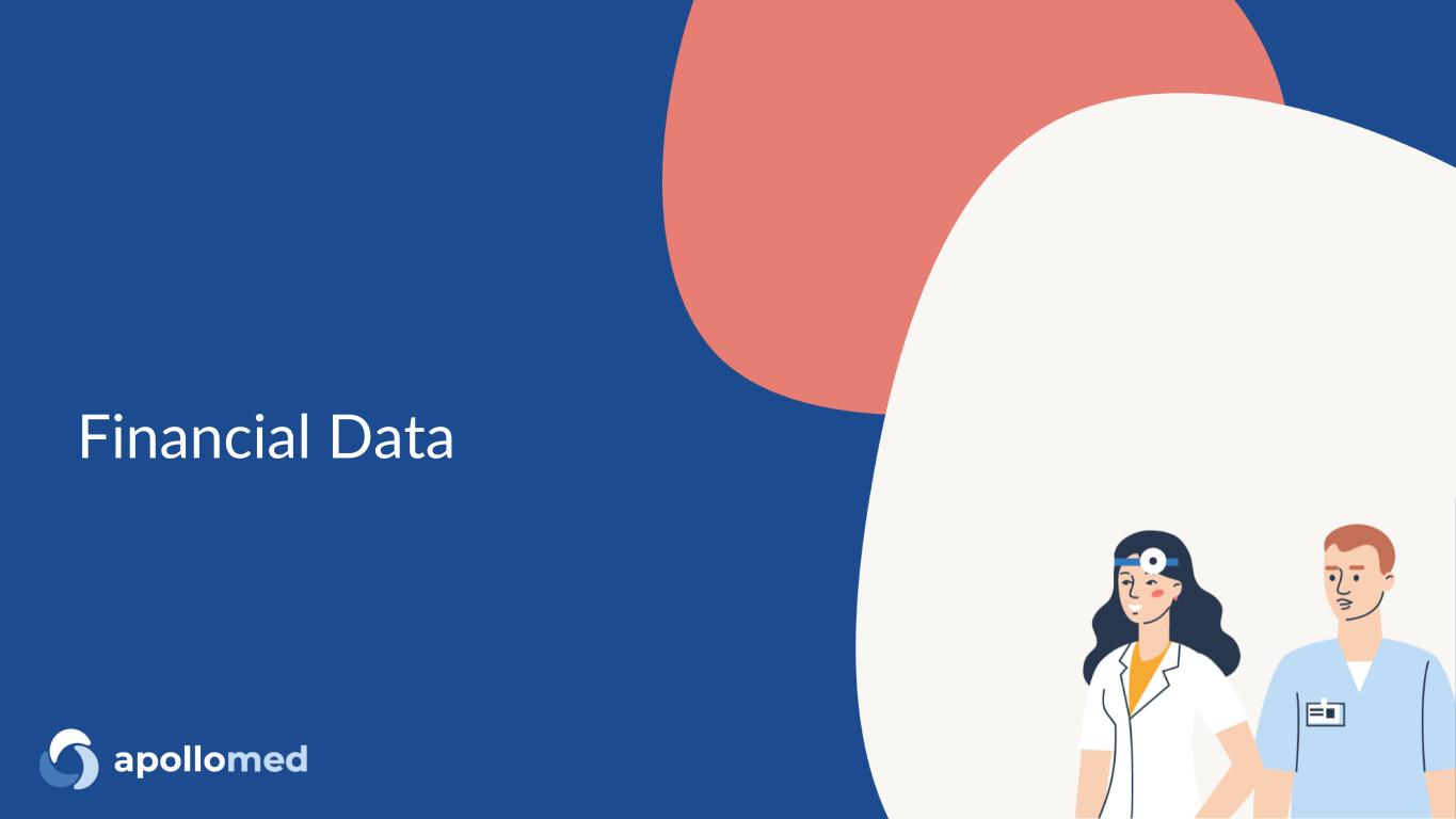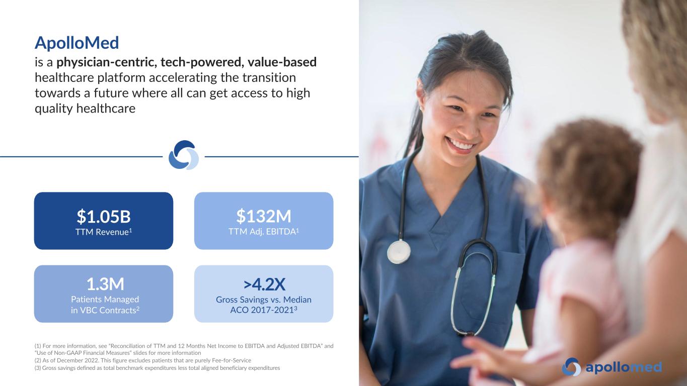 $132M TTM Adj. EBITDA1 1.3M Patients Managed in VBC Contracts2 $1.05B TTM Revenue1 >4.2X Gross Savings vs. Median ACO 2017-20213 (1) For more information, see “Reconciliation of TTM and 12 Months Net Income to EBITDA and Adjusted EBITDA” and “Use of Non-GAAP Financial Measures“ slides for more information (2) As of December 2022. This figure excludes patients that are purely Fee-for-Service (3) Gross savings defined as total benchmark expenditures less total aligned beneficiary expenditures ApolloMed is a physician-centric, tech-powered, value-based healthcare platform accelerating the transition towards a future where all can get access to high quality healthcare