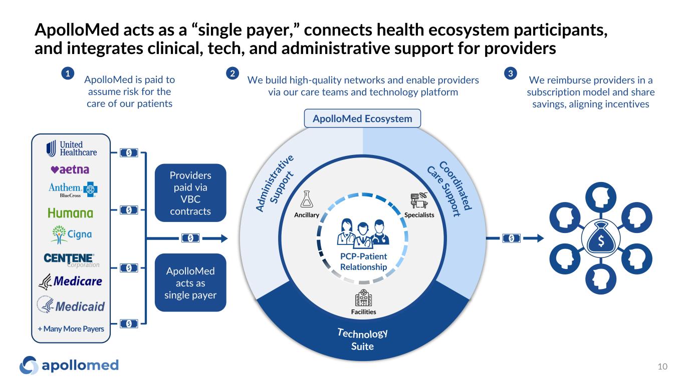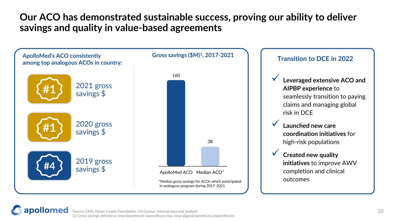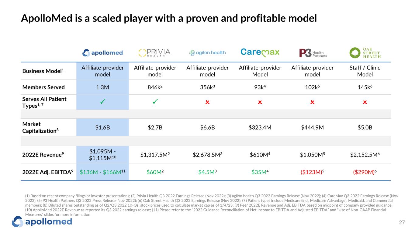 $132M TTM Adj. EBITDA1 1.3M Patients Managed in VBC Contracts2 $1.05B TTM Revenue1 >4.2X Gross Savings vs. Median ACO 2017-20213 (1) For more information, see “Reconciliation of TTM and 12 Months Net Income to EBITDA and Adjusted EBITDA” and “Use of Non-GAAP Financial Measures“ slides for more information (2) As of December 2022. This figure excludes patients that are purely Fee-for-Service (3) Gross savings defined as total benchmark expenditures less total aligned beneficiary expenditures ApolloMed is a physician-centric, tech-powered, value-based healthcare platform accelerating the transition towards a future where all can get access to high quality healthcare