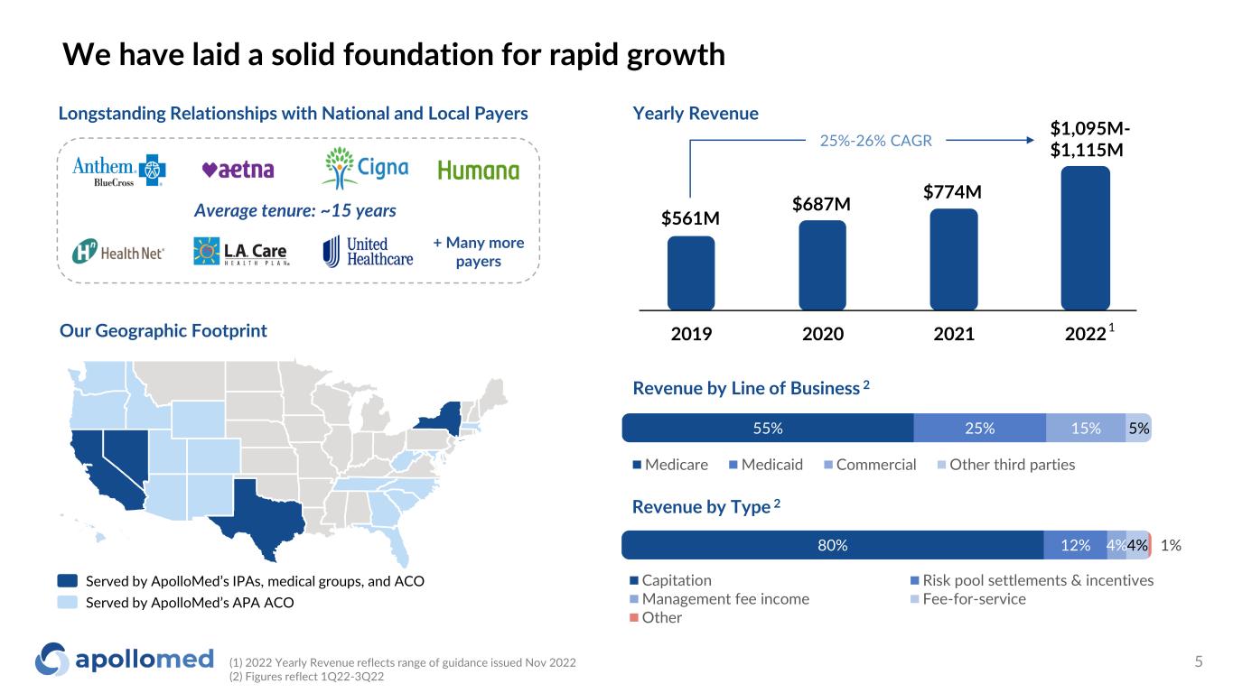 (1) Medicare Advantage, Managed Medicaid, Commercial, ACA Exchange, and Medicare FFS (2) ApolloMed 2019 to 2022E revenue growth; ApolloMed 2019 to 2022E adj. EBITDA growth. Please refer to the “2022 Guidance Reconciliation of Net Income to EBITDA and Adjusted EBITDA” and “Use of Non-GAAP Financial Measures” slides for more information 4 1. 2. 3. 5. 6. 4. Accelerating high quality, value-based care across all patient populations1 Strong growth, with 3-year CAGR2 for revenue of 25-26%, and for adj. EBITDA of 36-45% Scalable approach that empowers entrepreneurial providers to deliver value-based care and industry-leading outcomes Purpose-built technology platform leveraging 25+ years of real-world clinical data Profitable, highly replicable unit economics TAM of $2T, growing across all populations and geographies ApolloMed investment highlights