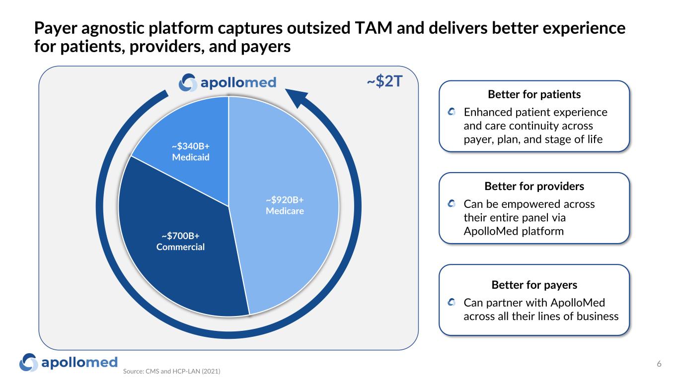 55% 25% 15% 5% Medicare Medicaid Commercial Other third parties Our Geographic Footprint Longstanding Relationships with National and Local Payers + Many more payers Served by ApolloMed’s IPAs, medical groups, and ACO Served by ApolloMed’s APA ACO 2019 2020 2021 2022 Yearly Revenue 1 Average tenure: ~15 years 80% 12% 4%4% 1% Capitation Risk pool settlements & incentives Management fee income Fee-for-service Other Revenue by Line of Business 2 Revenue by Type 2 $561M $687M $774M $1,095M- $1,115M25%-26% CAGR (1) 2022 Yearly Revenue reflects range of guidance issued Nov 2022 (2) Figures reflect 1Q22-3Q22 5 We have laid a solid foundation for rapid growth