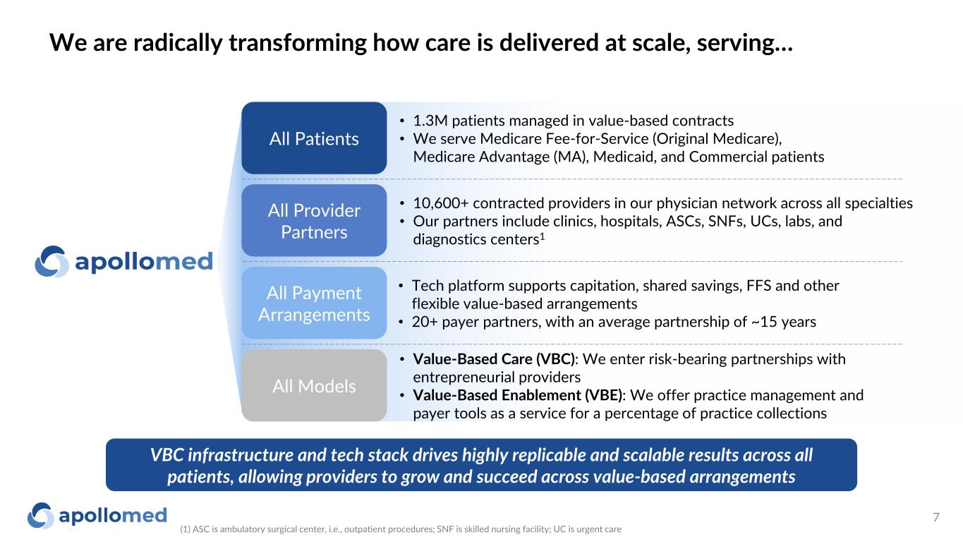 Payer agnostic platform captures outsized TAM and delivers better experience for patients, providers, and payers Source: CMS and HCP-LAN (2021) 6 Better for patients Enhanced patient experience and care continuity across payer, plan, and stage of life Better for providers Can be empowered across their entire panel via ApolloMed platform Better for payers Can partner with ApolloMed across all their lines of business ~$340B+ Medicaid ~$700B+ Commercial ~$920B+ Medicare ~$2T