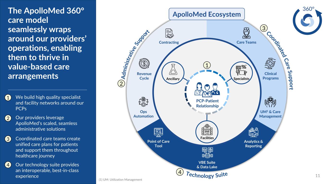 ApolloMed acts as a “single payer,” connects health ecosystem participants, and integrates clinical, tech, and administrative support for providers 10 ApolloMed is paid to assume risk for the care of our patients 1 We reimburse providers in a subscription model and share savings, aligning incentives 3 We build high-quality networks and enable providers via our care teams and technology platform 2 PCP-Patient Relationship Specialists Facilities Ancillary ApolloMed Ecosystem ApolloMed acts as single payer Providers paid via VBC contracts + Many More Payers