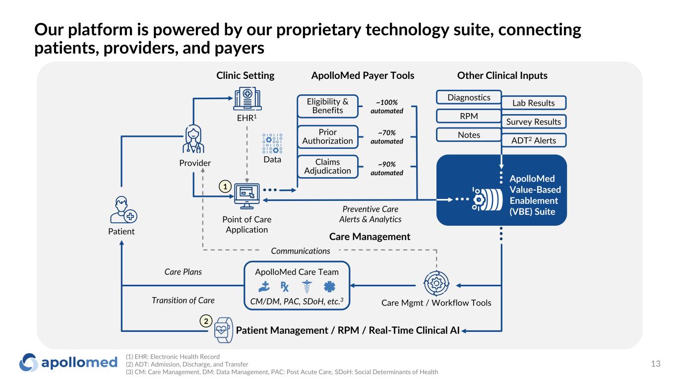 We are changing healthcare through a physician-centric approach that provides flexibility and scale for our providers Industry Status Quo ApolloMed Patients supported throughout care journey by our ecosystem and care teams Entrepreneurial physicians can remain independent and partner with ApolloMed Capitated reimbursement and value-based incentives with ApolloMed as payer Data aggregated onto interoperable platform; providers leverage ApolloMed tech-suite Physicians can support patients through different life stages and payer choices No unified care plan for patients across multiple visits to a fragmented healthcare system Physicians must choose to be employed or tackle administrative functions alone Complex reporting requirements and incongruous incentives from different payers Many different tech stacks and non-interoperable point solutions Physicians can only serve limited patients 12