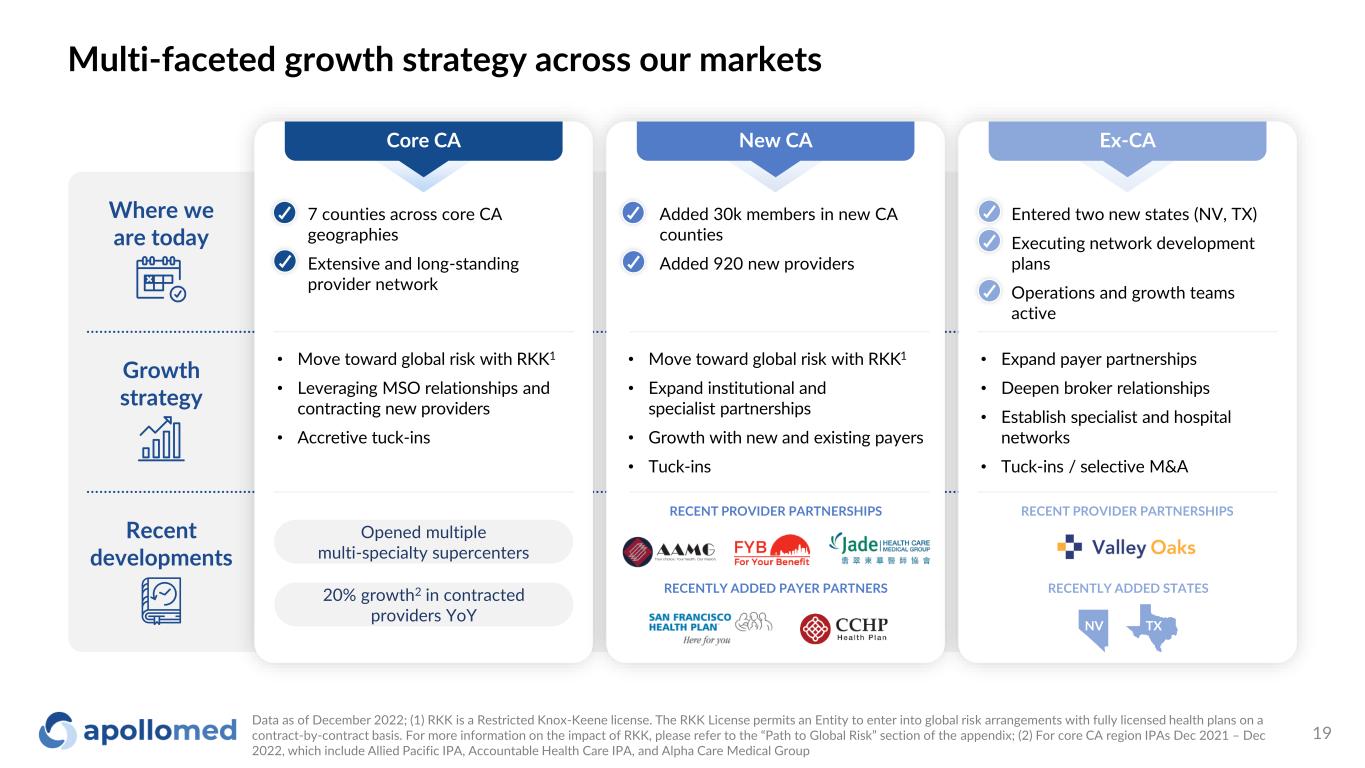 Two clear levers combine to drive 30%+ growth per year Data as of Q3 2022; (1) Note that in CA markets we have capability to more quickly accelerate new patients along risk ladder, and start patients beyond PCP Cap Only; (2) Increasing risk in value-based contracts corresponds to larger opportunity size in value-based care Lower risk ($) Higher risk2 ($) Members by risk type and geography Core CA New CA Ex-CA FFS PCP Cap Only1 Professional Risk Full Risk Global Risk 500K+ N/A 250K – 500K 250K – 500K 10K – 100K 500K+ N/A 5K – 10K 5K - 10K <5K 500K+ <5K N/A N/A N/A Increasing risk in value-based contracts Take more risk and manage to great clinical outcomes Expanding membership Develop clinical excellence and local scale to attract membership Core CA Securing nationwide payer contracts and establishing local provider partnershipsEx-CA Extending our specialist & facility partnerships around existing anchor PCP groups Leveraging our dense, high quality provider network and best-in-class facilities New CA Membership expansion drivers 18