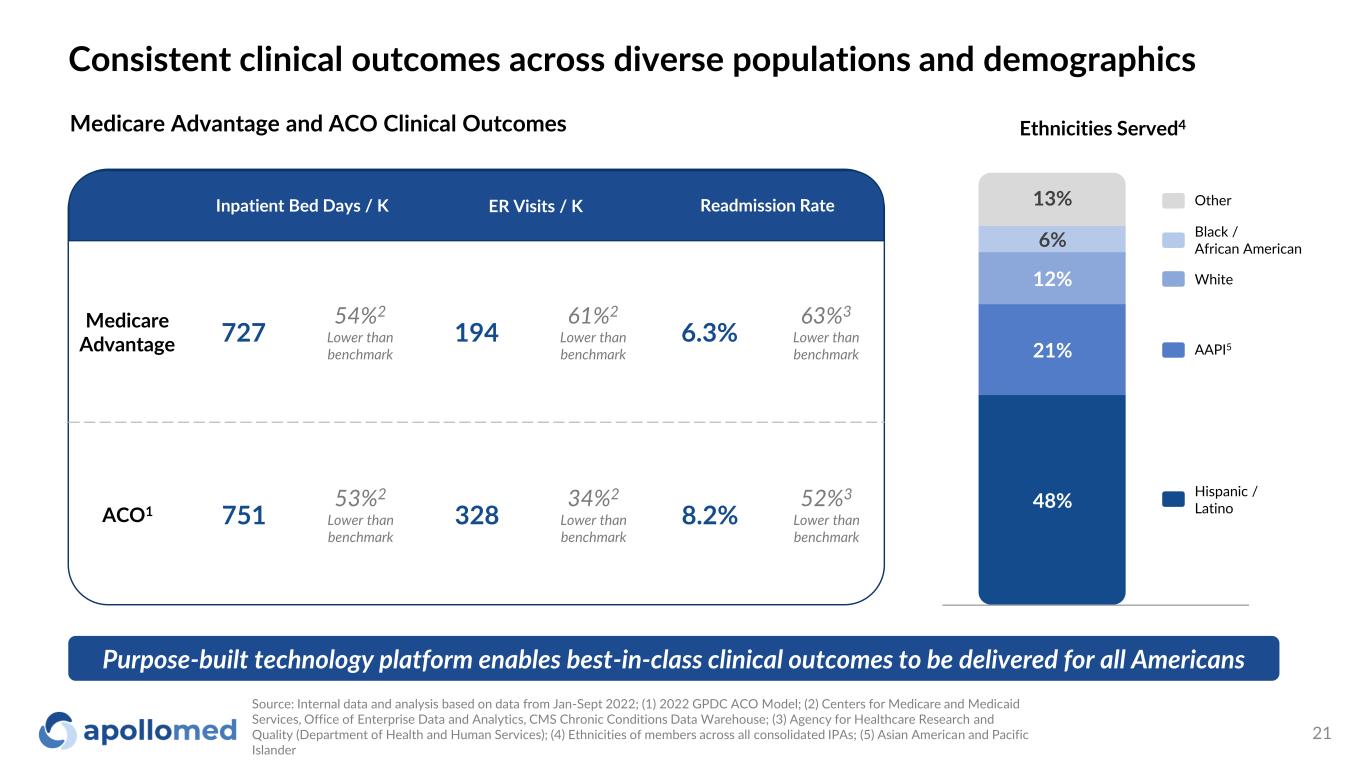 Consistent clinical outcomes across diverse populations and demographics Medicare Advantage and ACO Clinical Outcomes Purpose-built technology platform enables best-in-class clinical outcomes to be delivered for all Americans Ethnicities Served4 48% 21% 12% 6% 13% Source: Internal data and analysis based on data from Jan-Sept 2022; (1) 2022 GPDC ACO Model; (2) Centers for Medicare and Medicaid Services, Office of Enterprise Data and Analytics, CMS Chronic Conditions Data Warehouse; (3) Agency for Healthcare Research and Quality (Department of Health and Human Services); (4) Ethnicities of members across all consolidated IPAs; (5) Asian American and Pacific Islander Hispanic / Latino AAPI5 White Black / African American Other Medicare Advantage 727 54%2 Lower than benchmark 194 61%2 Lower than benchmark 6.3% 63%3 Lower than benchmark ACO1 751 53%2 Lower than benchmark 328 34%2 Lower than benchmark 8.2% 52%3 Lower than benchmark Inpatient Bed Days / K ER Visits / K Readmission Rate 21