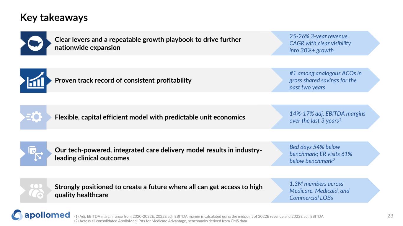14%-17% adj. EBITDA margins over the last 3 years1 Bed days 54% below benchmark; ER visits 61% below benchmark2 1.3M members across Medicare, Medicaid, and Commercial LOBs #1 among analogous ACOs in gross shared savings for the past two years Key takeaways Strongly positioned to create a future where all can get access to high quality healthcare Proven track record of consistent profitability Our tech-powered, integrated care delivery model results in industry- leading clinical outcomes Flexible, capital efficient model with predictable unit economics Clear levers and a repeatable growth playbook to drive further nationwide expansion (1) Adj. EBITDA margin range from 2020-2022E. 2022E adj. EBITDA margin is calculated using the midpoint of 2022E revenue and 2022E adj. EBITDA (2) Across all consolidated ApolloMed IPAs for Medicare Advantage, benchmarks derived from CMS data 25-26% 3-year revenue CAGR with clear visibility into 30%+ growth 23