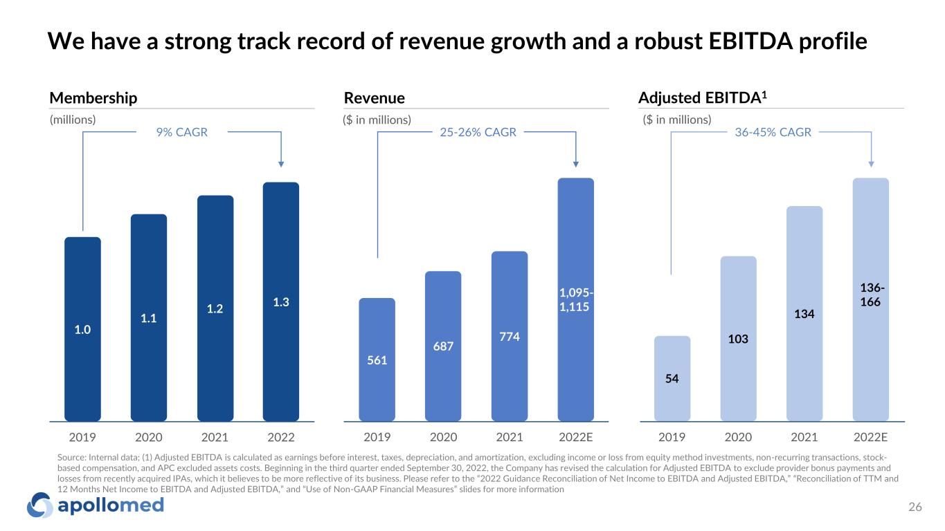 We have a strong track record of revenue growth and a robust EBITDA profile ($ in millions) Revenue 25-26% CAGR ($ in millions) Adjusted EBITDA1 36-45% CAGR 1,095- 1,115 Source: Internal data; (1) Adjusted EBITDA is calculated as earnings before interest, taxes, depreciation, and amortization, excluding income or loss from equity method investments, non-recurring transactions, stock- based compensation, and APC excluded assets costs. Beginning in the third quarter ended September 30, 2022, the Company has revised the calculation for Adjusted EBITDA to exclude provider bonus payments and losses from recently acquired IPAs, which it believes to be more reflective of its business. Please refer to the “2022 Guidance Reconciliation of Net Income to EBITDA and Adjusted EBITDA,” “Reconciliation of TTM and 12 Months Net Income to EBITDA and Adjusted EBITDA,” and “Use of Non-GAAP Financial Measures” slides for more information 561 687 774 2019 2020 2021 2022E 1,095- 1,115 54 103 134 2019 2020 2021 2022E 136- 166 Membership 9% CAGR 1.0 1.1 1.2 1.3 2019 2020 2021 2022 (millions) 26