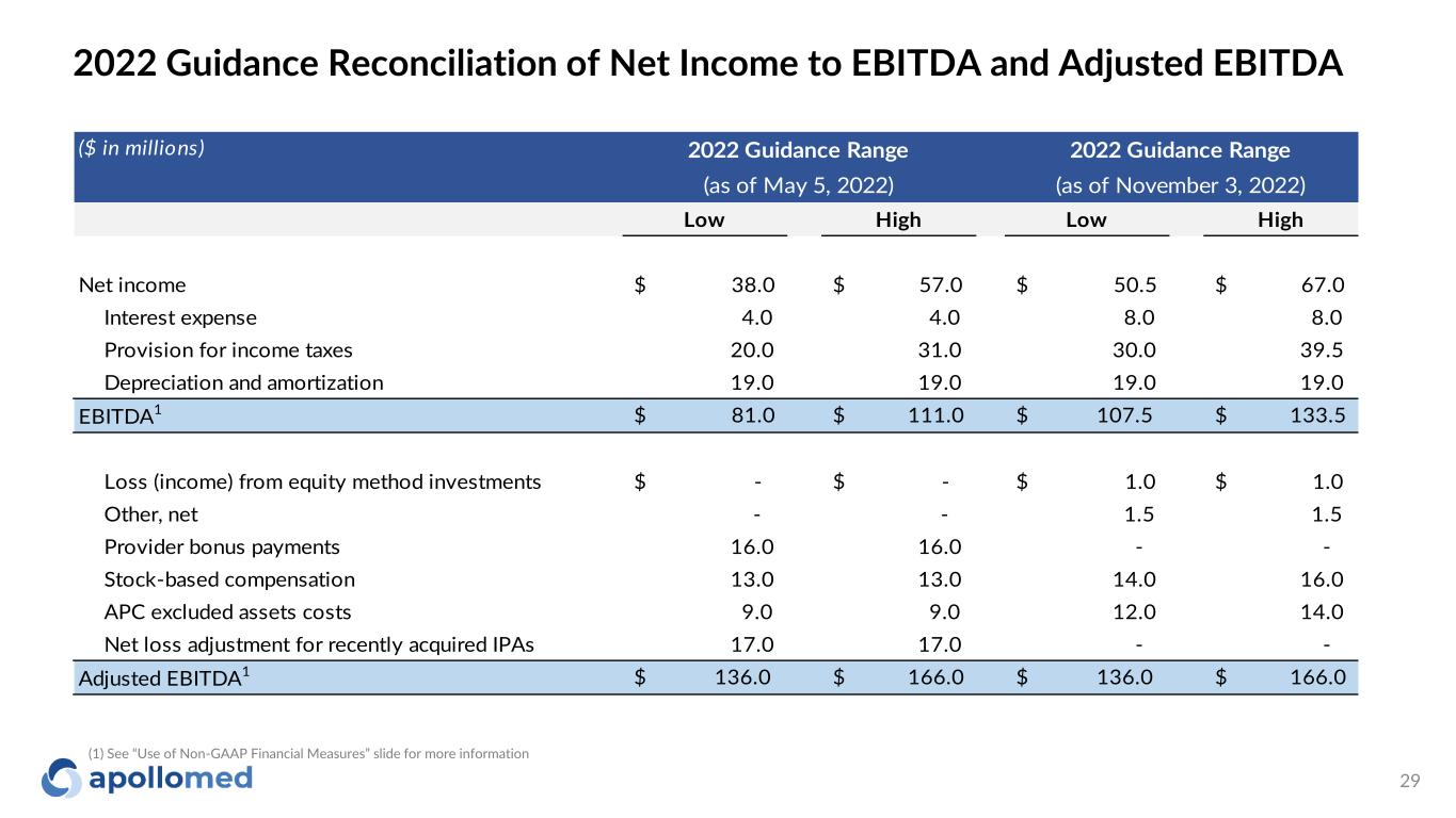 Updated 2022 Guidance ($ in millions) 2022 Guidance Range (as of May 5, 2022) 2022 Guidance Range (as of November 3, 2022) Total Revenue $1,055.0 - $1,085.0 $1,095.0 - $1,115.0 Net Income1 $38.0 - $57.0 $50.5 - $67.0 EBITDA1,2 $81.0 - $111.0 $107.5 - $133.5 Adjusted EBITDA2 $136.0 - $166.0 $136.0 - $166.0 (1) Net income and EBITDA forecast includes the impact of APC’s investment in a payer partner that completed an initial public offering and became publicly traded on June 24, 2021. The revised net income and EBITDA guidance ranges assume the payer partner’s stock price of $1.05 (2) See “2022 Guidance Reconciliation of Net Income to EBITDA and Adjusted EBITDA” and “Use of Non-GAAP Financial Measures” slides for more information. There can be no assurance that actual amounts will not be materially higher or lower than these expectations. See “Forward-Looking Statements” on slide 2 28