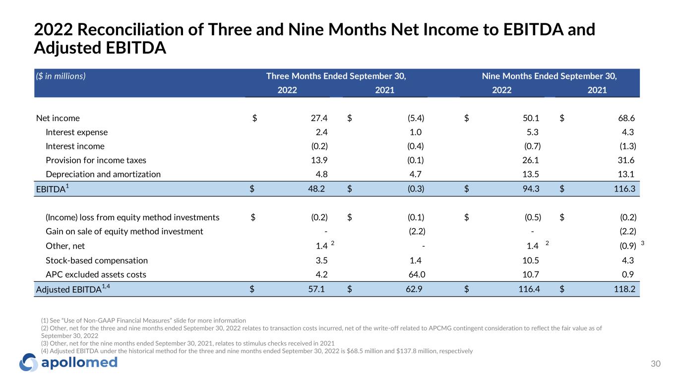 2022 Guidance Reconciliation of Net Income to EBITDA and Adjusted EBITDA ($ in millions) Low High Low High Net income $ 38.0 $ 57.0 $ 50.5 $ 67.0 Interest expense 4.0 4.0 8.0 8.0 Provision for income taxes 20.0 31.0 30.0 39.5 Depreciation and amortization 19.0 19.0 19.0 19.0 EBITDA1 $ 81.0 $ 111.0 $ 107.5 $ 133.5 Loss (income) from equity method investments $ - $ - $ 1.0 $ 1.0 Other, net - - 1.5 1.5 Provider bonus payments 16.0 16.0 - - Stock-based compensation 13.0 13.0 14.0 16.0 APC excluded assets costs 9.0 9.0 12.0 14.0 Net loss adjustment for recently acquired IPAs 17.0 17.0 - - Adjusted EBITDA1 $ 136.0 $ 166.0 $ 136.0 $ 166.0 2022 Guidance Range (as of May 5, 2022) 2022 Guidance Range (as of November 3, 2022) (1) See “Use of Non-GAAP Financial Measures” slide for more information 29