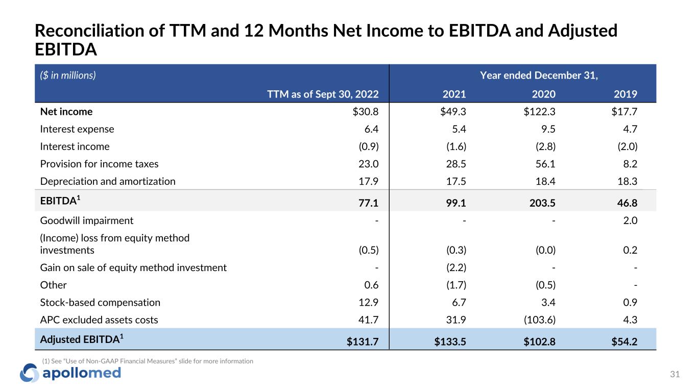 2022 Reconciliation of Three and Nine Months Net Income to EBITDA and Adjusted EBITDA ($ in millions) 2022 2021 2022 2021 Net income $ 27.4 $ (5.4) $ 50.1 $ 68.6 Interest expense 2.4 1.0 5.3 4.3 Interest income (0.2) (0.4) (0.7) (1.3) Provision for income taxes 13.9 (0.1) 26.1 31.6 Depreciation and amortization 4.8 4.7 13.5 13.1 EBITDA1 $ 48.2 $ (0.3) $ 94.3 $ 116.3 (Income) loss from equity method investments $ (0.2) $ (0.1) $ (0.5) $ (0.2) Gain on sale of equity method investment - (2.2) - (2.2) Other, net 1.4 2 - 1.4 2 (0.9) 3 Stock-based compensation 3.5 1.4 10.5 4.3 APC excluded assets costs 4.2 64.0 10.7 0.9 Adjusted EBITDA1,4 $ 57.1 $ 62.9 $ 116.4 $ 118.2 Three Months Ended September 30, Nine Months Ended September 30, (1) See “Use of Non-GAAP Financial Measures” slide for more information (2) Other, net for the three and nine months ended September 30, 2022 relates to transaction costs incurred, net of the write-off related to APCMG contingent consideration to reflect the fair value as of September 30, 2022 (3) Other, net for the nine months ended September 30, 2021, relates to stimulus checks received in 2021 (4) Adjusted EBITDA under the historical method for the three and nine months ended September 30, 2022 is $68.5 million and $137.8 million, respectively 30