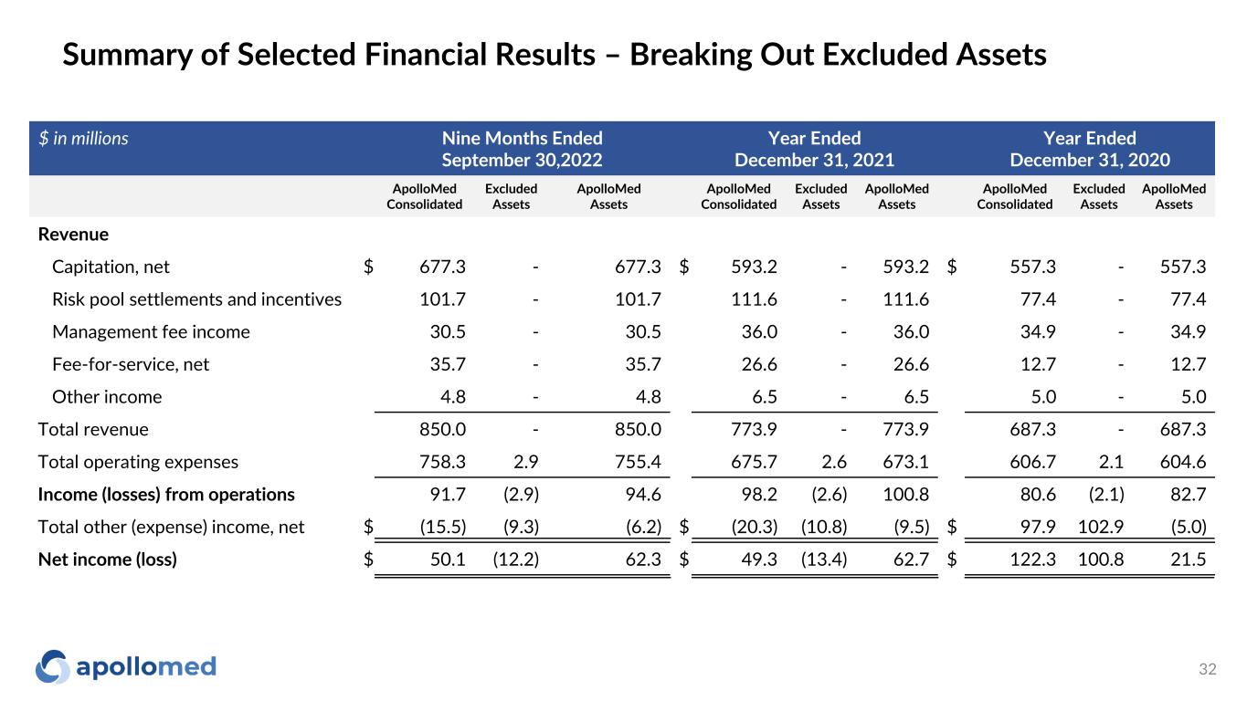 $ in millions Nine Months Ended September 30,2022 Year Ended December 31, 2021 Year Ended December 31, 2020 ApolloMed Consolidated Excluded Assets ApolloMed Assets ApolloMed Consolidated Excluded Assets ApolloMed Assets ApolloMed Consolidated Excluded Assets ApolloMed Assets Revenue Capitation, net $ 677.3 - 677.3 $ 593.2 - 593.2 $ 557.3 - 557.3 Risk pool settlements and incentives 101.7 - 101.7 111.6 - 111.6 77.4 - 77.4 Management fee income 30.5 - 30.5 36.0 - 36.0 34.9 - 34.9 Fee-for-service, net 35.7 - 35.7 26.6 - 26.6 12.7 - 12.7 Other income 4.8 - 4.8 6.5 - 6.5 5.0 - 5.0 Total revenue 850.0 - 850.0 773.9 - 773.9 687.3 - 687.3 Total operating expenses 758.3 2.9 755.4 675.7 2.6 673.1 606.7 2.1 604.6 Income (losses) from operations 91.7 (2.9) 94.6 98.2 (2.6) 100.8 80.6 (2.1) 82.7 Total other (expense) income, net $ (15.5) (9.3) (6.2) $ (20.3) (10.8) (9.5) $ 97.9 102.9 (5.0) Net income (loss) $ 50.1 (12.2) 62.3 $ 49.3 (13.4) 62.7 $ 122.3 100.8 21.5 Summary of Selected Financial Results – Breaking Out Excluded Assets 32