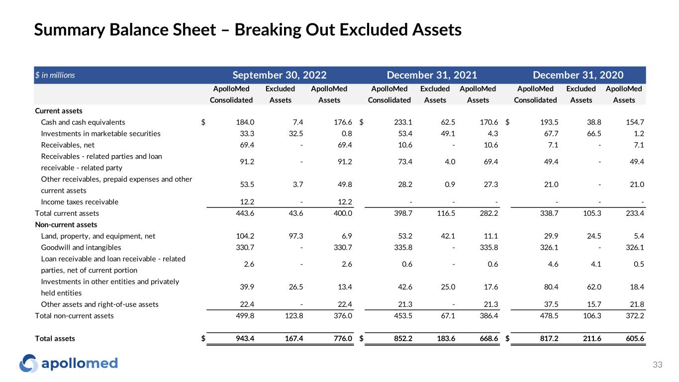 $ in millions ApolloMed Consolidated Excluded Assets ApolloMed Assets ApolloMed Consolidated Excluded Assets ApolloMed Assets ApolloMed Consolidated Excluded Assets ApolloMed Assets Current assets Cash and cash equivalents $ 184.0 7.4 176.6 $ 233.1 62.5 170.6 $ 193.5 38.8 154.7 Investments in marketable securities 33.3 32.5 0.8 53.4 49.1 4.3 67.7 66.5 1.2 Receivables, net 69.4 - 69.4 10.6 - 10.6 7.1 - 7.1 Receivables - related parties and loan receivable - related party 91.2 - 91.2 73.4 4.0 69.4 49.4 - 49.4 Other receivables, prepaid expenses and other current assets 53.5 3.7 49.8 28.2 0.9 27.3 21.0 - 21.0 Income taxes receivable 12.2 - 12.2 - - - - - - Total current assets 443.6 43.6 400.0 398.7 116.5 282.2 338.7 105.3 233.4 Non-current assets Land, property, and equipment, net 104.2 97.3 6.9 53.2 42.1 11.1 29.9 24.5 5.4 Goodwill and intangibles 330.7 - 330.7 335.8 - 335.8 326.1 - 326.1 Loan receivable and loan receivable - related parties, net of current portion 2.6 - 2.6 0.6 - 0.6 4.6 4.1 0.5 Investments in other entities and privately held entities 39.9 26.5 13.4 42.6 25.0 17.6 80.4 62.0 18.4 Other assets and right-of-use assets 22.4 - 22.4 21.3 - 21.3 37.5 15.7 21.8 Total non-current assets 499.8 123.8 376.0 453.5 67.1 386.4 478.5 106.3 372.2 Total assets $ 943.4 167.4 776.0 $ 852.2 183.6 668.6 $ 817.2 211.6 605.6 September 30, 2022 December 31, 2021 December 31, 2020 Summary Balance Sheet – Breaking Out Excluded Assets 33