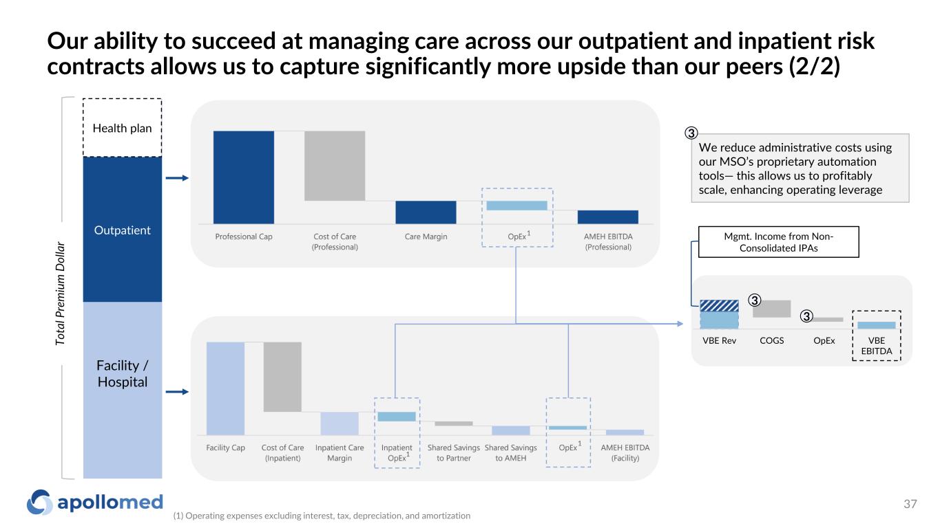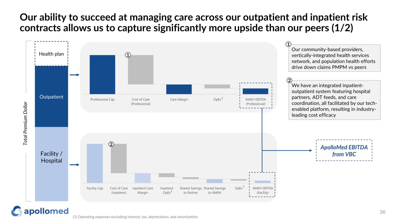 Our ability to succeed at managing care across our outpatient and inpatient risk contracts allows us to capture significantly more upside than our peers (1/2) Facility / Hospital Outpatient To ta l P re m iu m D ol la r ApolloMed EBITDA from VBC We have an integrated inpatient- outpatient system featuring hospital partners, ADT feeds, and care coordination, all facilitated by our tech- enabled platform, resulting in industry- leading cost efficacy 2 1 2 Health plan Our community-based providers, vertically-integrated health services network, and population health efforts drive down claims PMPM vs peers 1 1 1 (1) Operating expenses excluding interest, tax, depreciation, and amortization 1 36