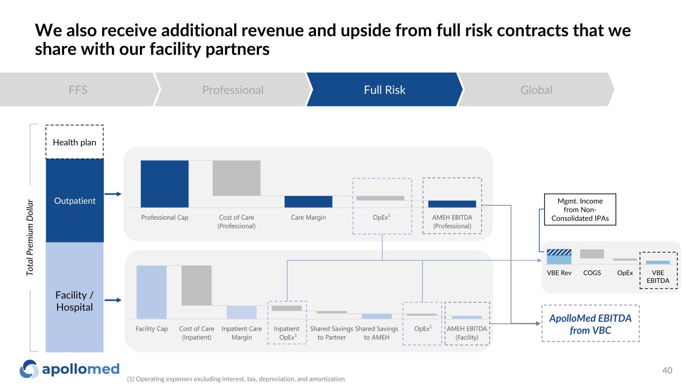 A significant part of our revenue today is generated by capitation from our professional risk contracts FFS Professional Full Risk Global 1 (1) Operating expenses excluding interest, tax, depreciation, and amortization 39