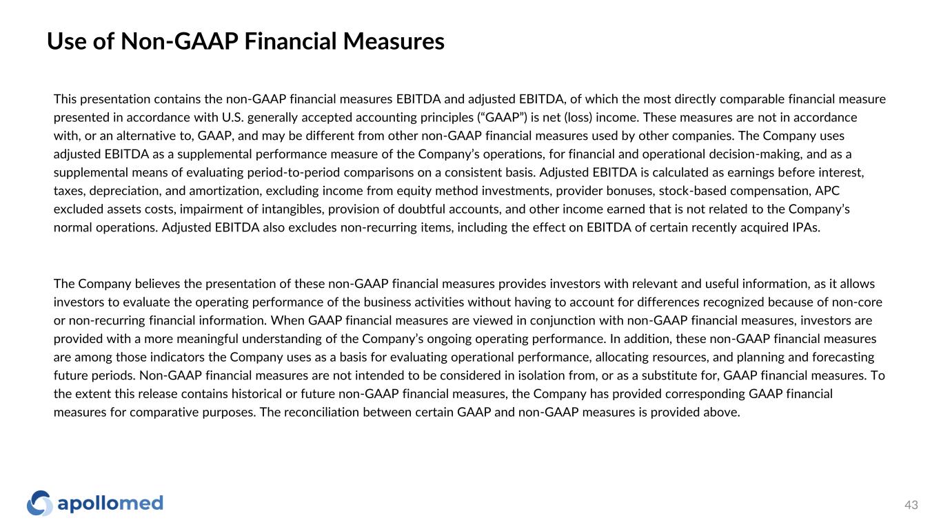 Use of Non-GAAP Financial Measures This presentation contains the non-GAAP financial measures EBITDA and adjusted EBITDA, of which the most directly comparable financial measure presented in accordance with U.S. generally accepted accounting principles (“GAAP”) is net (loss) income. These measures are not in accordance with, or an alternative to, GAAP, and may be different from other non-GAAP financial measures used by other companies. The Company uses adjusted EBITDA as a supplemental performance measure of the Company’s operations, for financial and operational decision-making, and as a supplemental means of evaluating period-to-period comparisons on a consistent basis. Adjusted EBITDA is calculated as earnings before interest, taxes, depreciation, and amortization, excluding income from equity method investments, provider bonuses, stock-based compensation, APC excluded assets costs, impairment of intangibles, provision of doubtful accounts, and other income earned that is not related to the Company’s normal operations. Adjusted EBITDA also excludes non-recurring items, including the effect on EBITDA of certain recently acquired IPAs. The Company believes the presentation of these non-GAAP financial measures provides investors with relevant and useful information, as it allows investors to evaluate the operating performance of the business activities without having to account for differences recognized because of non-core or non-recurring financial information. When GAAP financial measures are viewed in conjunction with non-GAAP financial measures, investors are provided with a more meaningful understanding of the Company’s ongoing operating performance. In addition, these non-GAAP financial measures are among those indicators the Company uses as a basis for evaluating operational performance, allocating resources, and planning and forecasting future periods. Non-GAAP financial measures are not intended to be considered in isolation from, or as a substitute for, GAAP financial measures. To the extent this release contains historical or future non-GAAP financial measures, the Company has provided corresponding GAAP financial measures for comparative purposes. The reconciliation between certain GAAP and non-GAAP measures is provided above. 43
