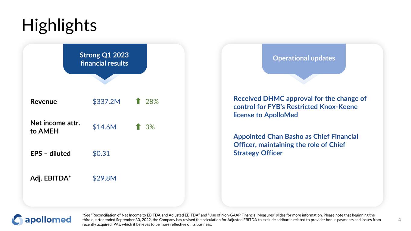 15* managed IPAs and groups 1.3M managed lives Company Overview 3 12,000+ contracted physicians 25+ years in operation ApolloMed is a technology-powered, value-based care healthcare platform that enables the delivery of high-quality, coordinated, efficient, and accessible care for all through the following business segments: ​ Care Enablement delivers an integrated clinical and administrative platform to enable payers and providers in the delivery of high quality, value based care. Care Partners enables aligned providers to participate in high- performance risk-bearing organizations. Care Delivery provides patient centric clinical operations, including primary care, multi-specialty, and ancillary services. ApolloMed At-A-Glance Ticker NASDAQ: AMEH Headquarters Alhambra, California Recent Stock Price (as of 5/4/2023) $34.15 Market Cap (as of 5/4/2023) $2.0 billion Common Shares Outstanding* (as of 5/2/2023) 57.5 million Book Value Per Common Share $9.79 TTM Revenues $1.22 billion IPA: independent physician association *As of 3/31/2023 *Includes 10.6 million in treasury shares Information as of 3/31/2023 unless otherwise noted