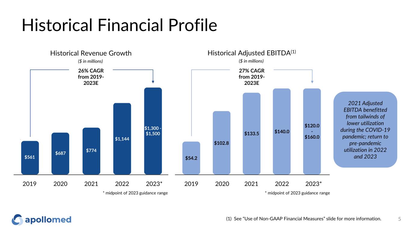 Highlights 4 Strong Q1 2023 financial results Operational updates Revenue $337.2M 28% Net income attr. to AMEH $14.6M 3% EPS – diluted $0.31 Adj. EBITDA* $29.8M Received DHMC approval for the change of control for FYB’s Restricted Knox-Keene license to ApolloMed Appointed Chan Basho as Chief Financial Officer, maintaining the role of Chief Strategy Officer *See “Reconciliation of Net Income to EBITDA and Adjusted EBITDA” and “Use of Non-GAAP Financial Measures” slides for more information. Please note that beginning the third quarter ended September 30, 2022, the Company has revised the calculation for Adjusted EBITDA to exclude addbacks related to provider bonus payments and losses from recently acquired IPAs, which it believes to be more reflective of its business.