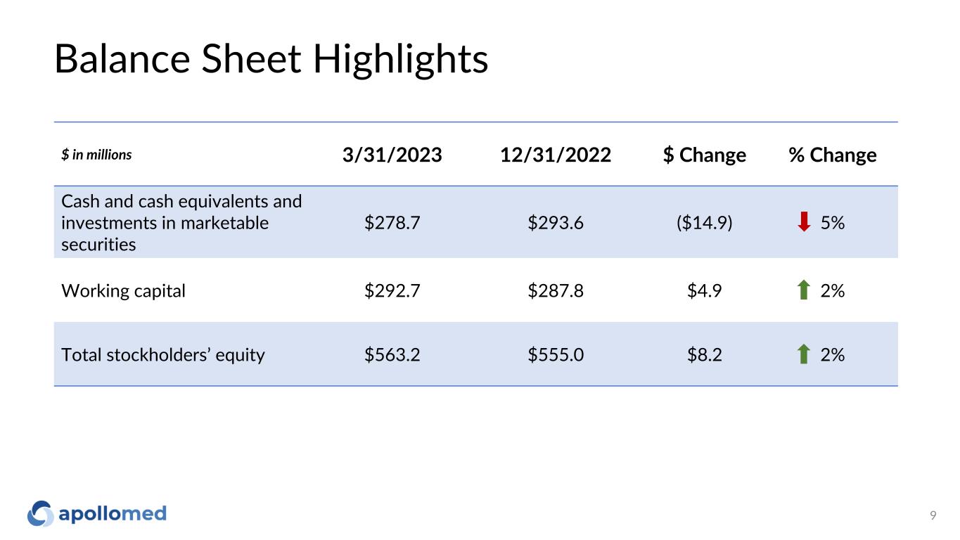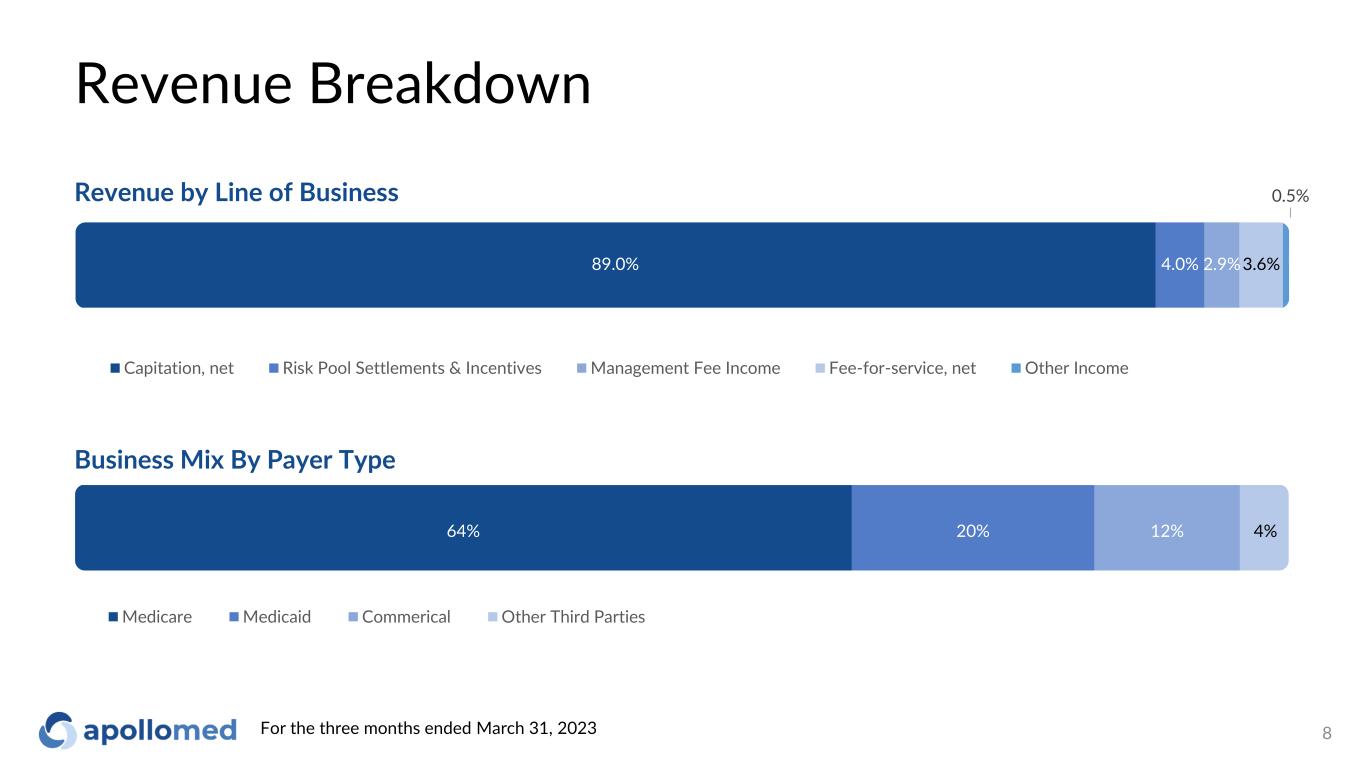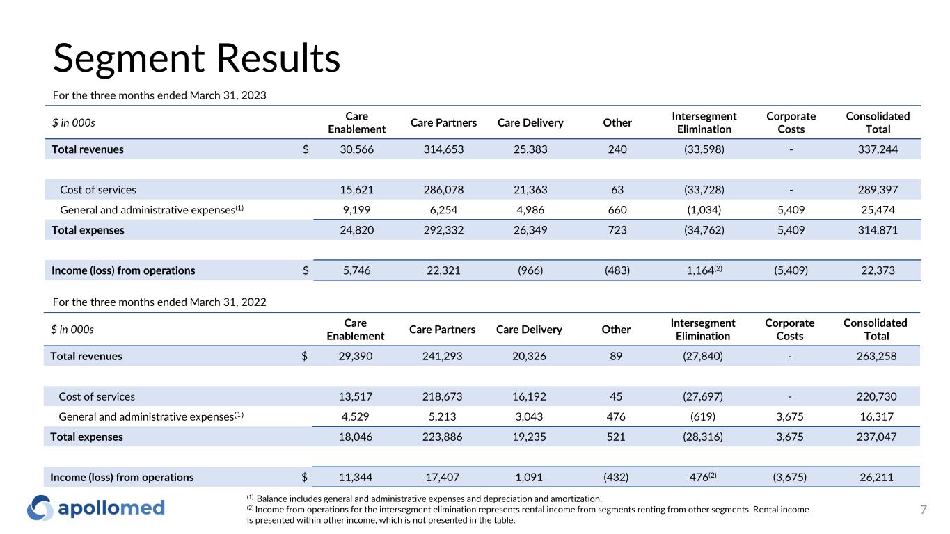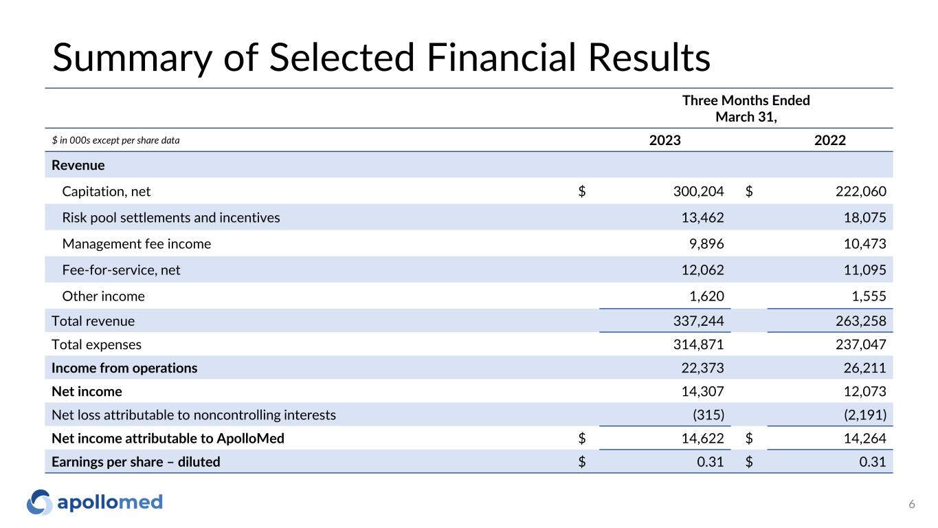 Summary of Selected Financial Results 6 Three Months Ended March 31, $ in 000s except per share data 2023 2022 Revenue Capitation, net $ 300,204 $ 222,060 Risk pool settlements and incentives 13,462 18,075 Management fee income 9,896 10,473 Fee-for-service, net 12,062 11,095 Other income 1,620 1,555 Total revenue 337,244 263,258 Total expenses 314,871 237,047 Income from operations 22,373 26,211 Net income 14,307 12,073 Net loss attributable to noncontrolling interests (315) (2,191) Net income attributable to ApolloMed $ 14,622 $ 14,264 Earnings per share – diluted $ 0.31 $ 0.31