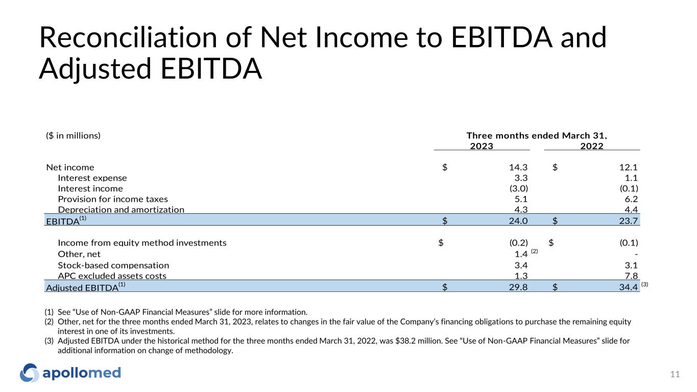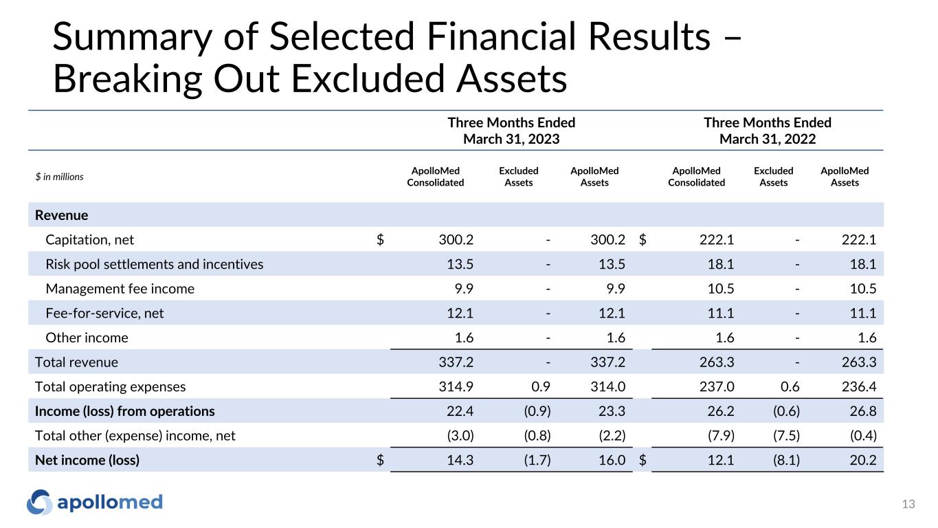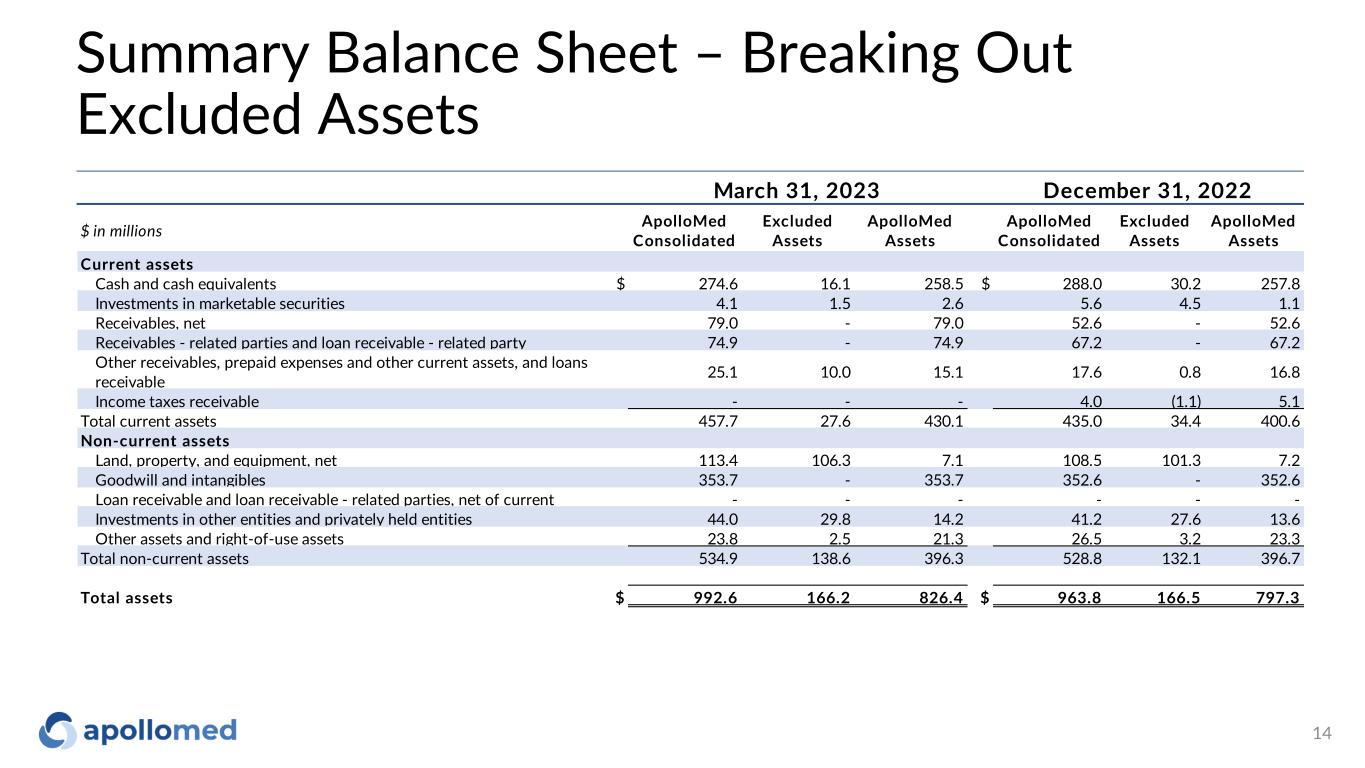 13 Three Months Ended March 31, 2023 Three Months Ended March 31, 2022 $ in millions ApolloMed Consolidated Excluded Assets ApolloMed Assets ApolloMed Consolidated Excluded Assets ApolloMed Assets Revenue Capitation, net $ 300.2 - 300.2 $ 222.1 - 222.1 Risk pool settlements and incentives 13.5 - 13.5 18.1 - 18.1 Management fee income 9.9 - 9.9 10.5 - 10.5 Fee-for-service, net 12.1 - 12.1 11.1 - 11.1 Other income 1.6 - 1.6 1.6 - 1.6 Total revenue 337.2 - 337.2 263.3 - 263.3 Total operating expenses 314.9 0.9 314.0 237.0 0.6 236.4 Income (loss) from operations 22.4 (0.9) 23.3 26.2 (0.6) 26.8 Total other (expense) income, net (3.0) (0.8) (2.2) (7.9) (7.5) (0.4) Net income (loss) $ 14.3 (1.7) 16.0 $ 12.1 (8.1) 20.2 Summary of Selected Financial Results – Breaking Out Excluded Assets