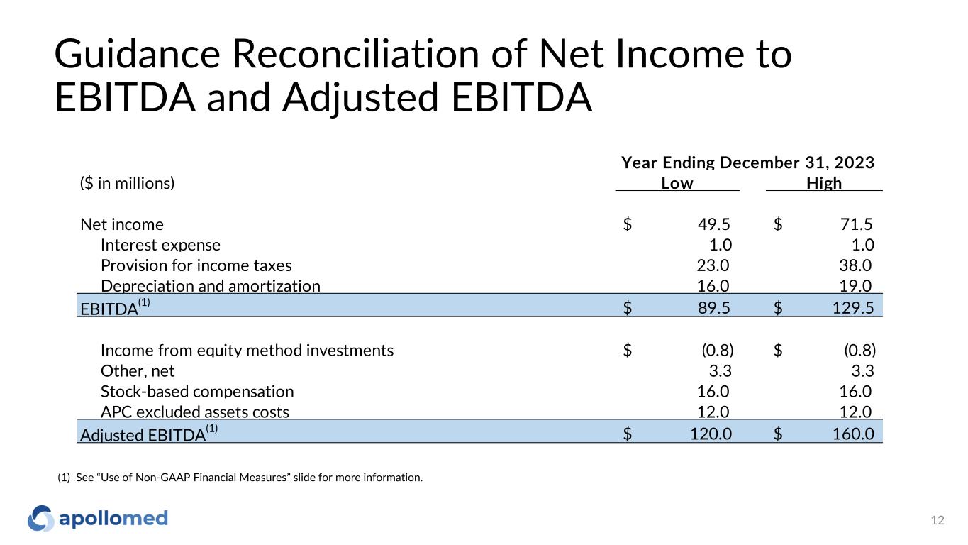 Reconciliation of Net Income to EBITDA and Adjusted EBITDA 11 (1) See “Use of Non-GAAP Financial Measures” slide for more information. (2) Other, net for the three months ended March 31, 2023, relates to changes in the fair value of the Company’s financing obligations to purchase the remaining equity interest in one of its investments. (3) Adjusted EBITDA under the historical method for the three months ended March 31, 2022, was $38.2 million. See “Use of Non-GAAP Financial Measures” slide for additional information on change of methodology. ($ in millions) 2023 2022 Net income $ 14.3 $ 12.1 Interest expense 3.3 1.1 Interest income (3.0) (0.1) Provision for income taxes 5.1 6.2 Depreciation and amortization 4.3 4.4 EBITDA(1) $ 24.0 $ 23.7 Income from equity method investments $ (0.2) $ (0.1) Other, net 1.4 (2) - Stock-based compensation 3.4 3.1 APC excluded assets costs 1.3 7.8 Adjusted EBITDA(1) $ 29.8 $ 34.4 (3) Three months ended March 31,