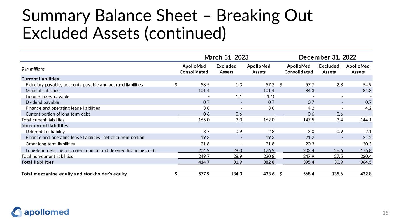 14 Summary Balance Sheet – Breaking Out Excluded Assets $ in millions ApolloMed Consolidated Excluded Assets ApolloMed Assets ApolloMed Consolidated Excluded Assets ApolloMed Assets Current assets Cash and cash equivalents $ 274.6 16.1 258.5 $ 288.0 30.2 257.8 Investments in marketable securities 4.1 1.5 2.6 5.6 4.5 1.1 Receivables, net 79.0 - 79.0 52.6 - 52.6 Receivables - related parties and loan receivable - related party 74.9 - 74.9 67.2 - 67.2 Other receivables, prepaid expenses and other current assets, and loans receivable 25.1 10.0 15.1 17.6 0.8 16.8 Income taxes receivable - - - 4.0 (1.1) 5.1 Total current assets 457.7 27.6 430.1 435.0 34.4 400.6 Non-current assets Land, property, and equipment, net 113.4 106.3 7.1 108.5 101.3 7.2 Goodwill and intangibles 353.7 - 353.7 352.6 - 352.6 Loan receivable and loan receivable - related parties, net of current - - - - - - Investments in other entities and privately held entities 44.0 29.8 14.2 41.2 27.6 13.6 Other assets and right-of-use assets 23.8 2.5 21.3 26.5 3.2 23.3 Total non-current assets 534.9 138.6 396.3 528.8 132.1 396.7 Total assets $ 992.6 166.2 826.4 $ 963.8 166.5 797.3 March 31, 2023 December 31, 2022